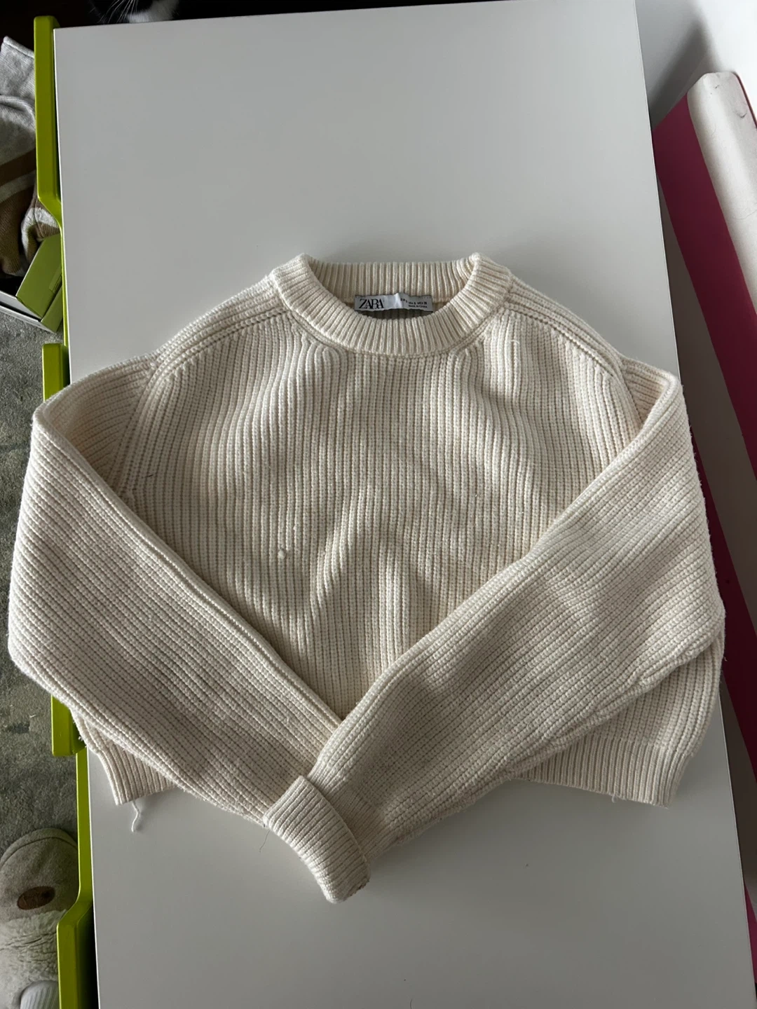 Cream-coloured ZARA sweater with a ribbed knit texture. It's a cropped style with long sleeves. Material is a blend of acrylic and polyester.