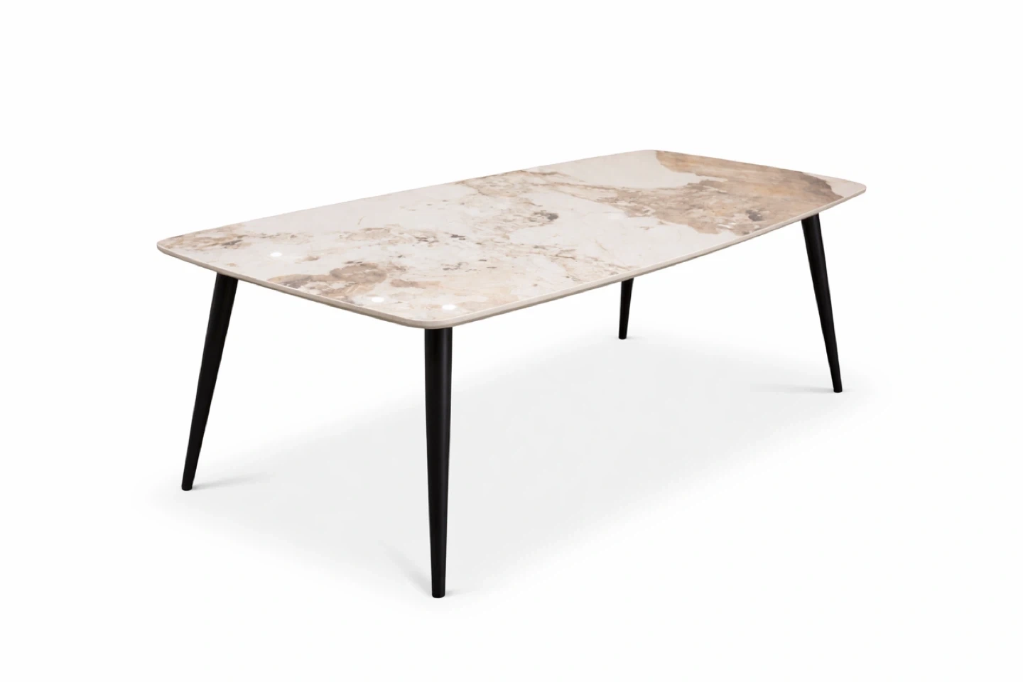 Rectangular dining table with a marble-look top and black tapered legs. It's suitable for seating up to six people. This table's sleek design makes it a great centerpiece for your dining area.