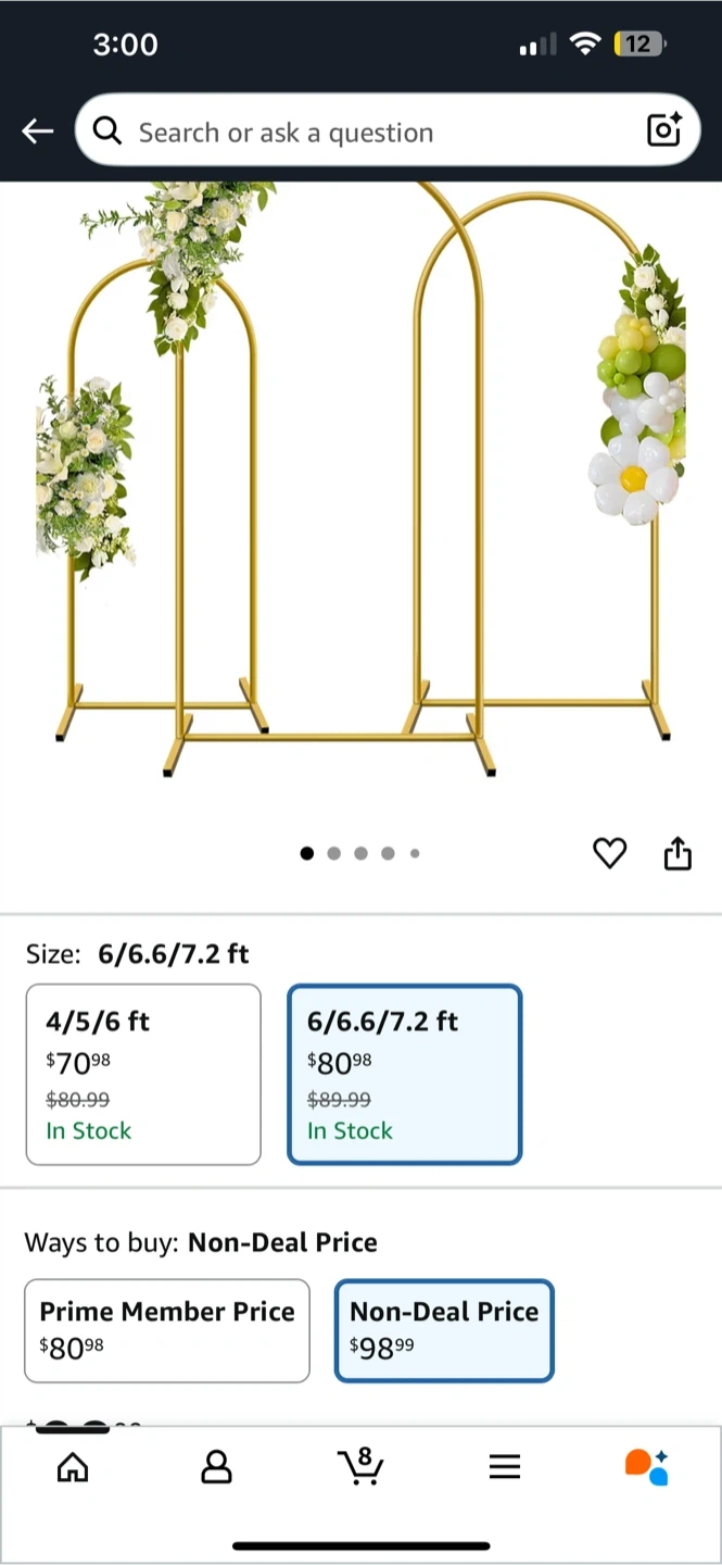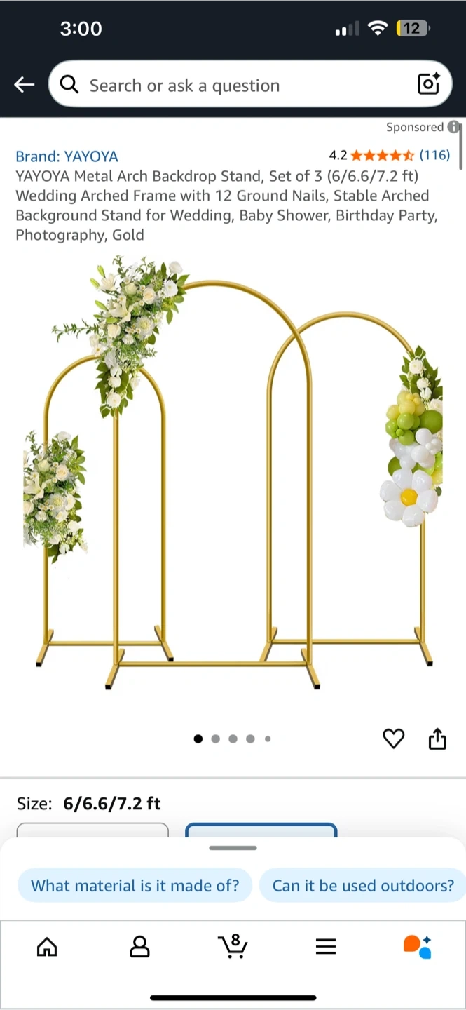 Selling a brand new YayoYa Metal Arch Backdrop Stand Set of 3. Perfect for weddings, baby showers, birthday parties, photography, or any special event! The set includes three arches, each sized at 6/6.6/7.2 ft. It also comes with 12 ground nails for stable setup. Original price is $98.99 Selling all 3 as the set If you are looking for an individual one then I have a round one available if you check out my other adds