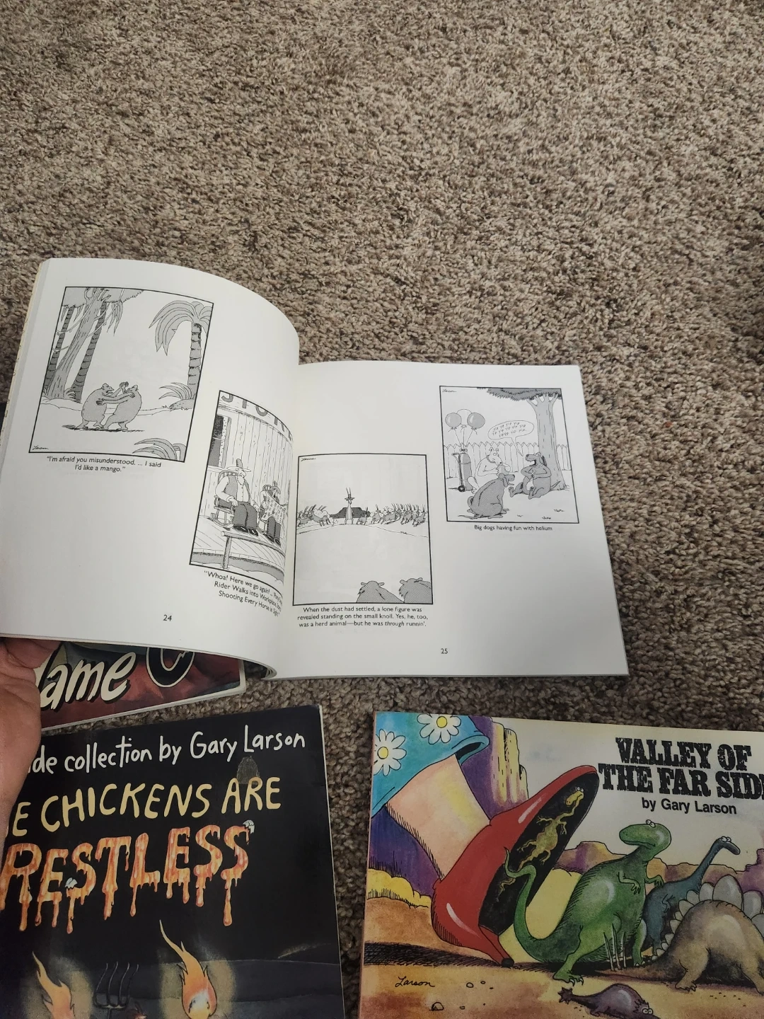 Bundle of four Far Side comic collections by Gary Larson. Titles include "The Curse of Madame C," "Valley of the Far Side," and "The Chickens Are Restless." Perfect for fans of this classic comic strip!