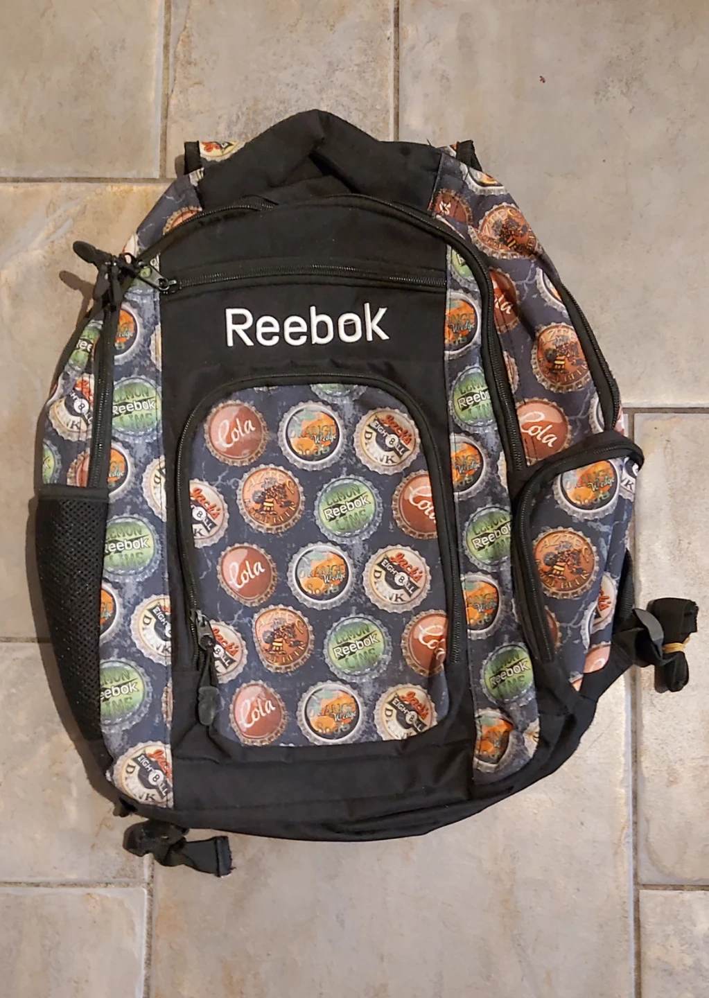 This Reebok backpack features a unique and colourful bottle cap design all over. It has a main zippered compartment and a front zippered pocket, plus side mesh pockets. It's great for carrying essentials for school or everyday use! In very good condition