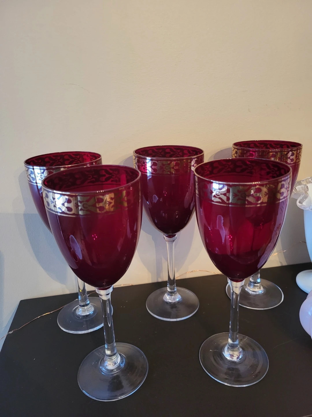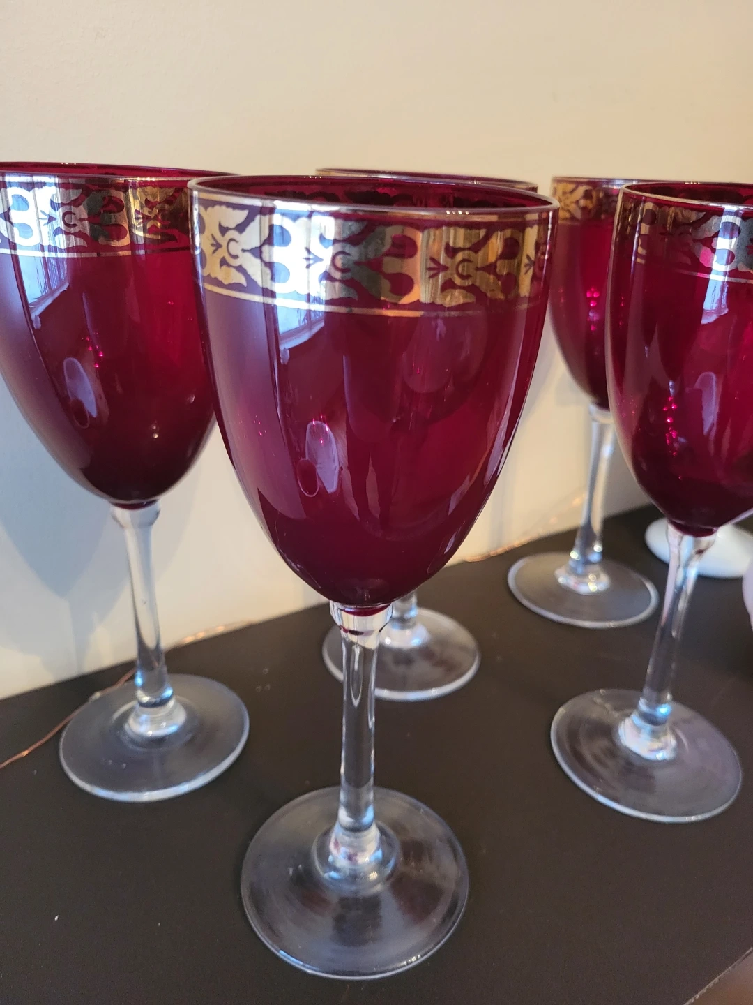 Set of 5 Ruby Red Crystal Wine Glasses with Gold Trim