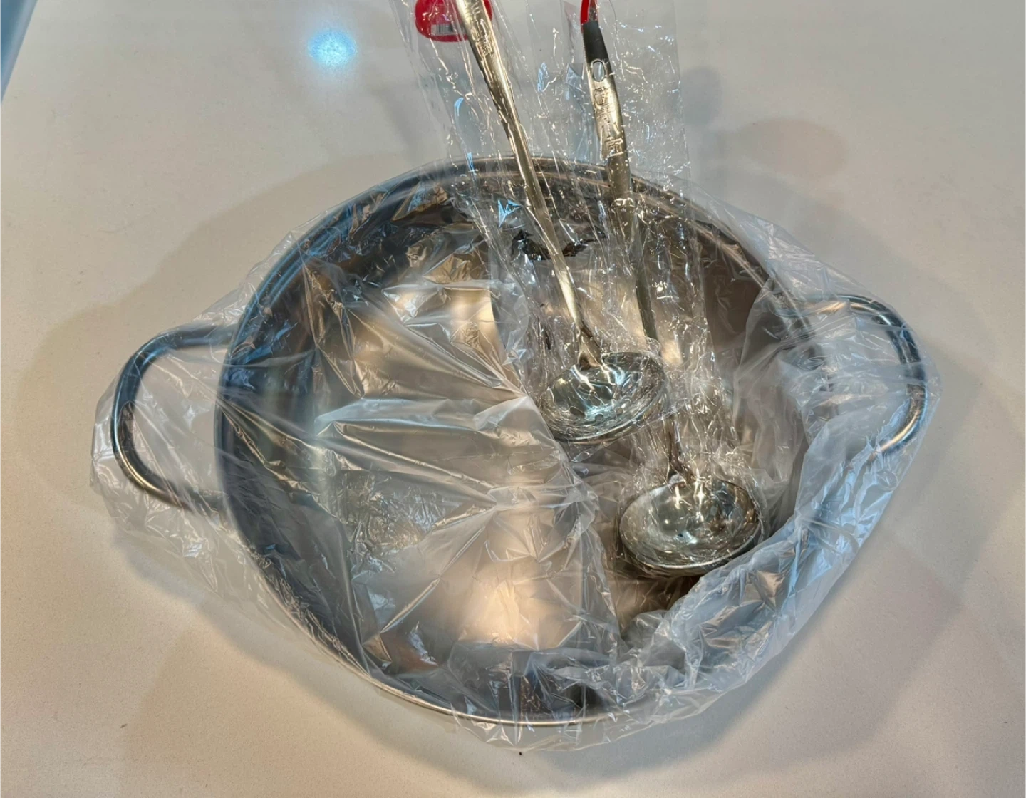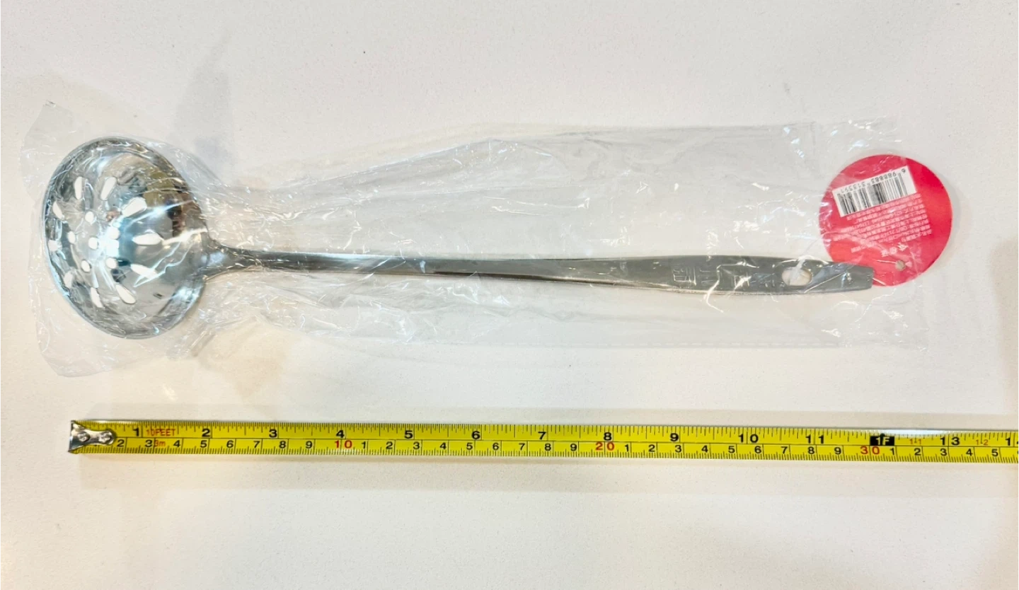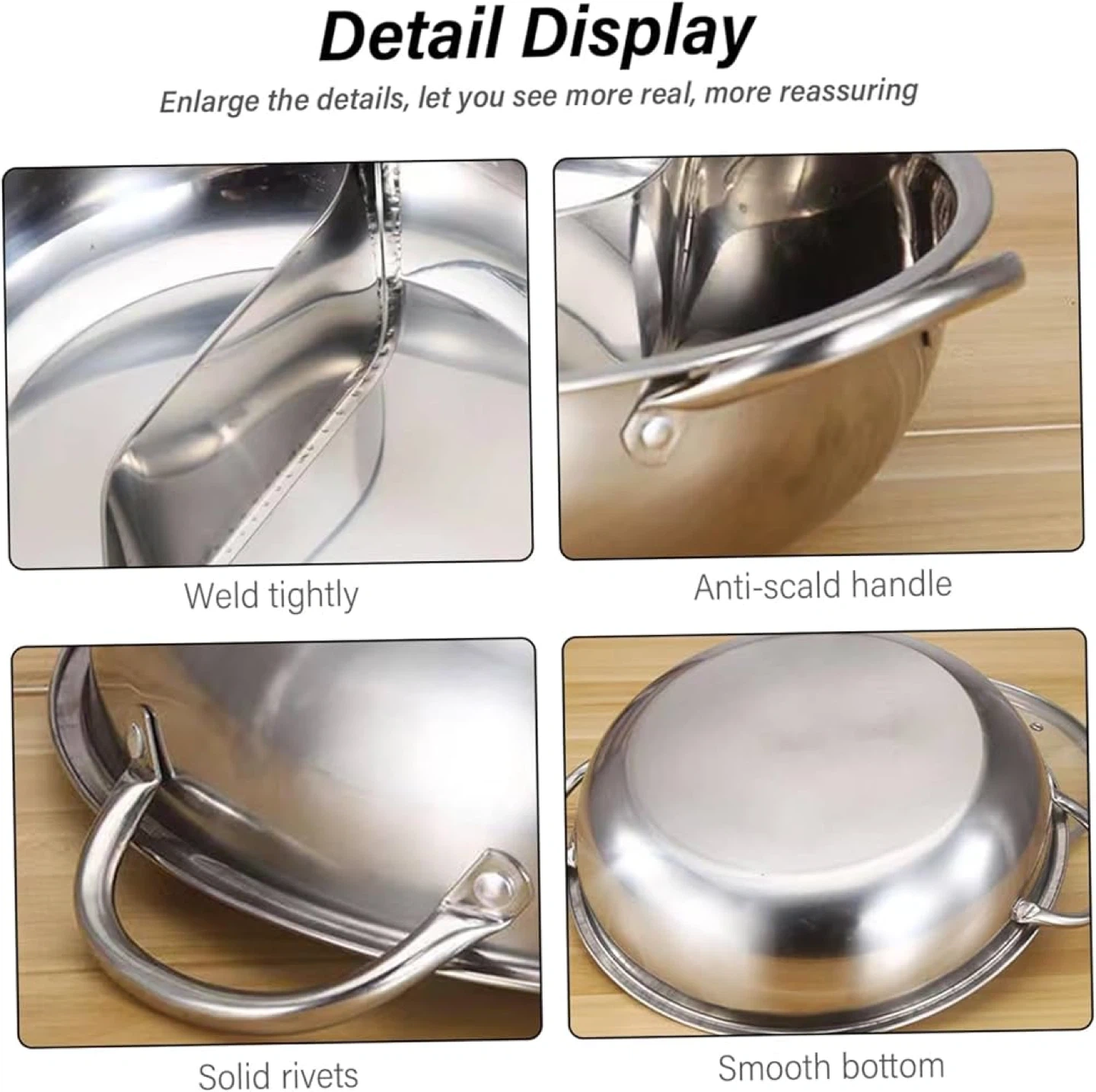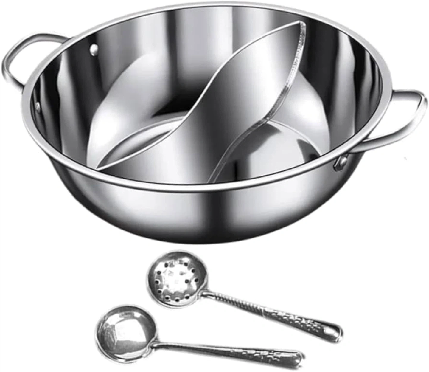 This is a dual-sided stainless steel hot pot, perfect for enjoying two different broths at once. It comes with two ladles, one slotted and one solid. The pot features anti-scald handles and is made from durable stainless steel.
