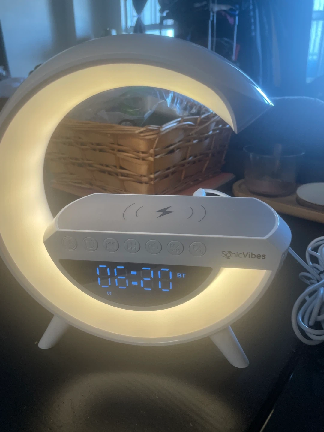 This SonicVibes lamp features a built-in wireless charger and an alarm clock. It's a bright white unit with a modern design. Includes buttons for alarm and light functions.