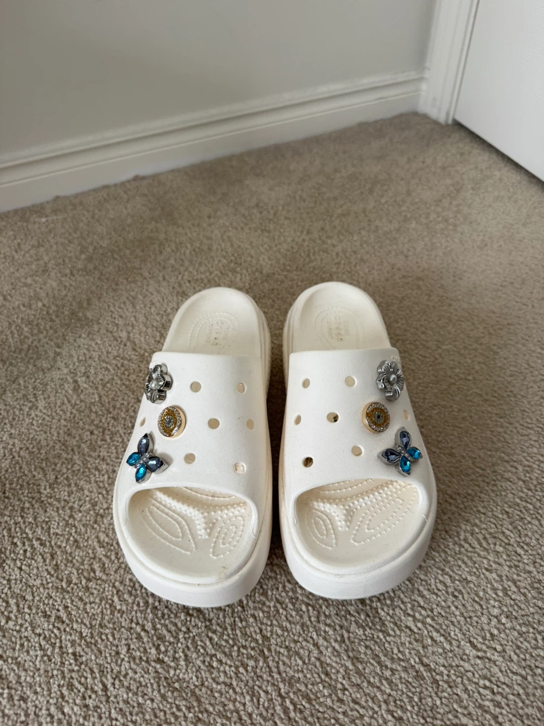 These white Crocs platform slides are a fun addition to any wardrobe. They feature decorative charms like flowers and butterflies for added flair. The platform sole provides a bit of extra height. These slides are great for casual wear, offering comfort and style!