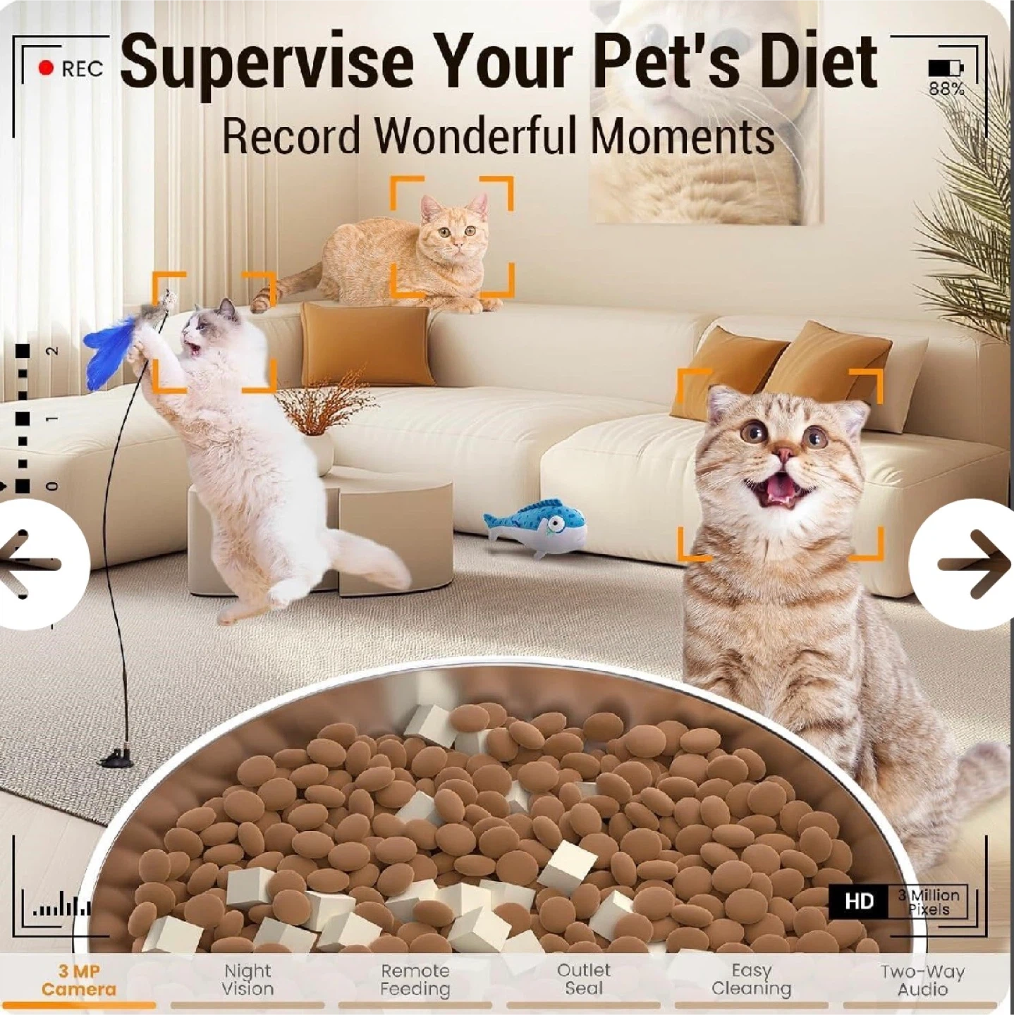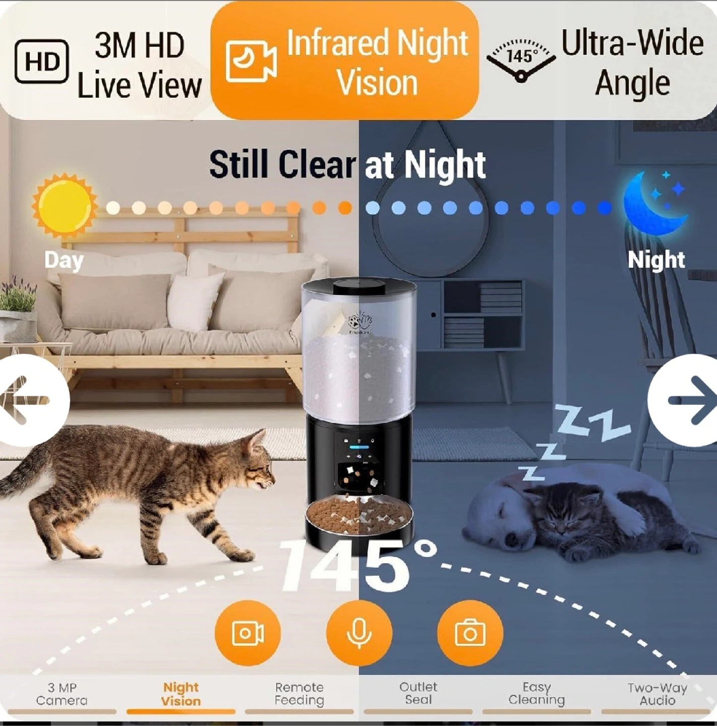 This smart pet feeder features a 3MP camera with night vision and ultra-wide angle. It allows for remote feeding with up to 15 portions and has two-way audio. It also offers a feeding schedule and records feeding activities.