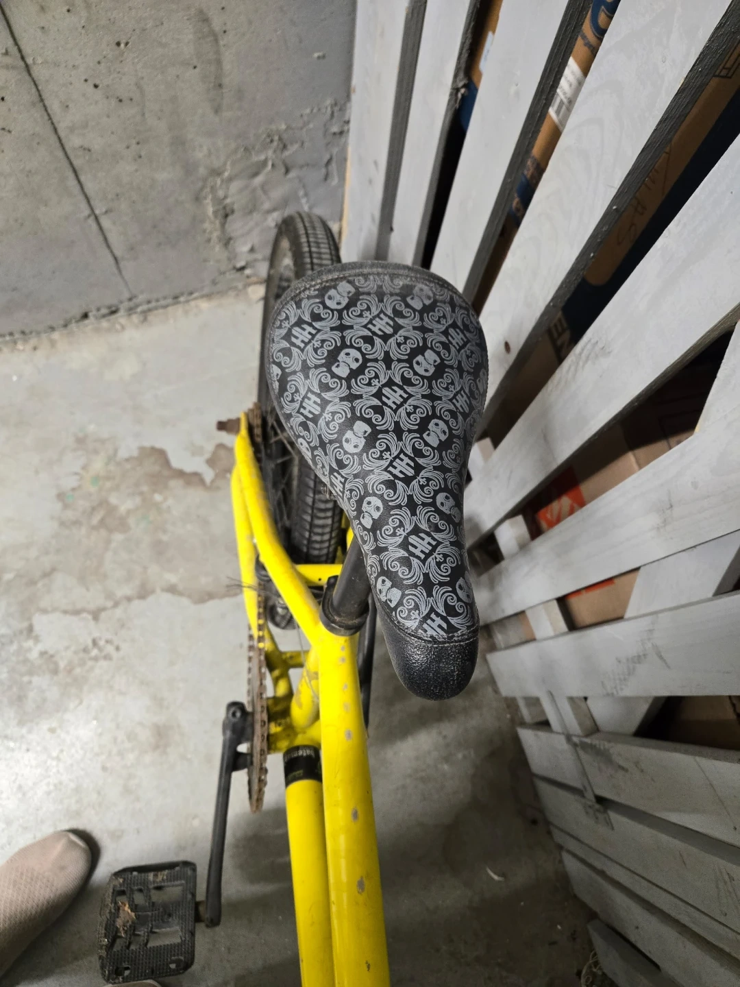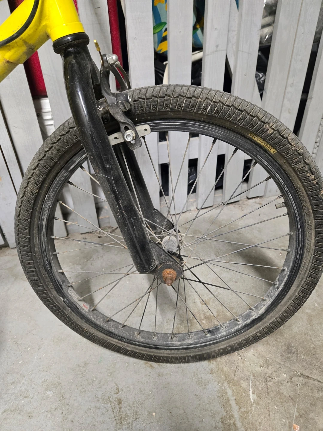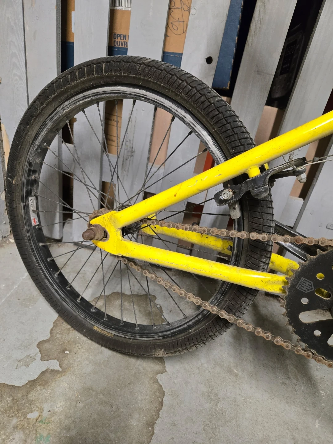 A bright yellow BMX bike. It features a standard frame with black handlebars and seat. The tires look like they're ready for some action!