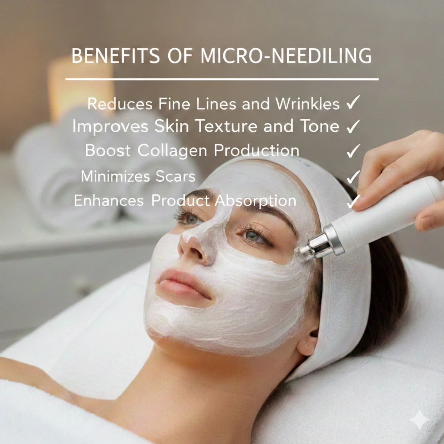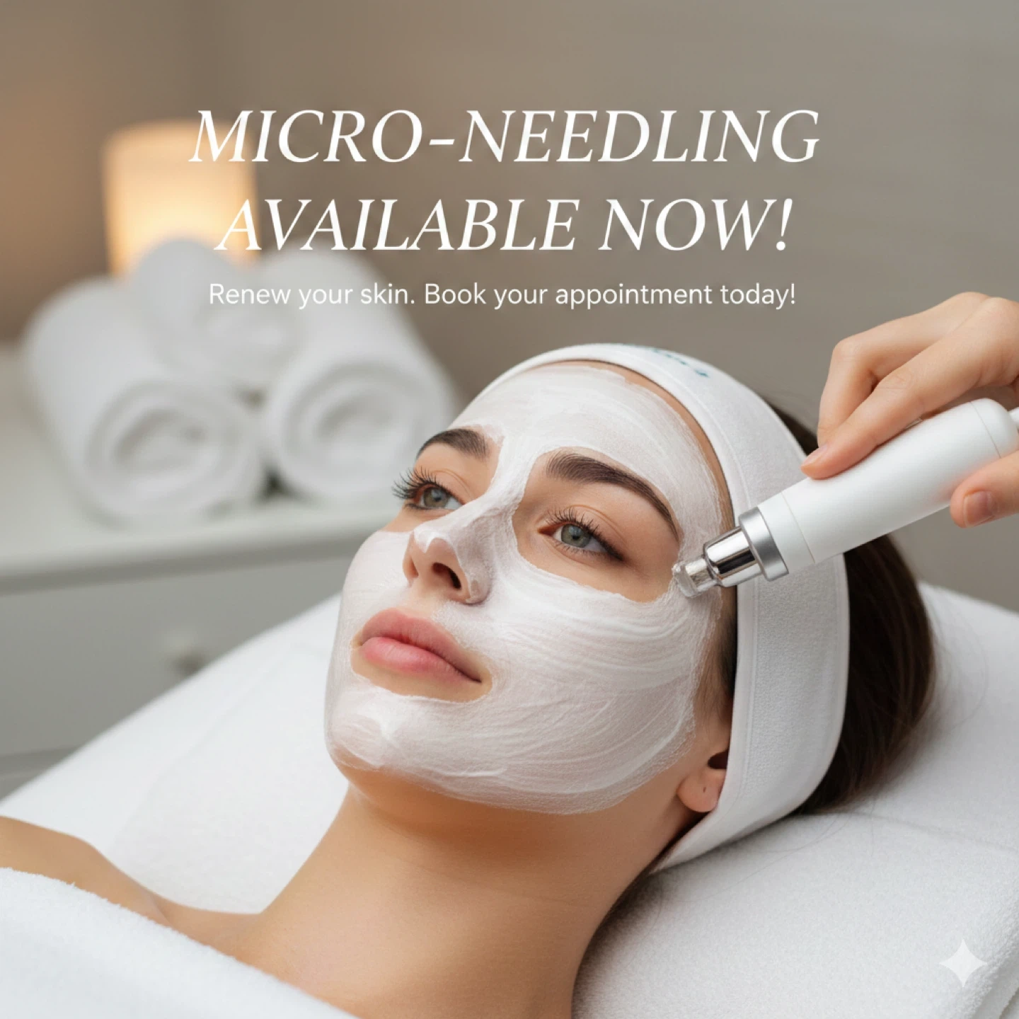Renew your skin with micro-needling! This treatment is available now to book. It helps reduce fine lines and wrinkles, improves skin texture and tone, boosts collagen production, minimizes scars, and enhances product absorption. Book your appointment today!