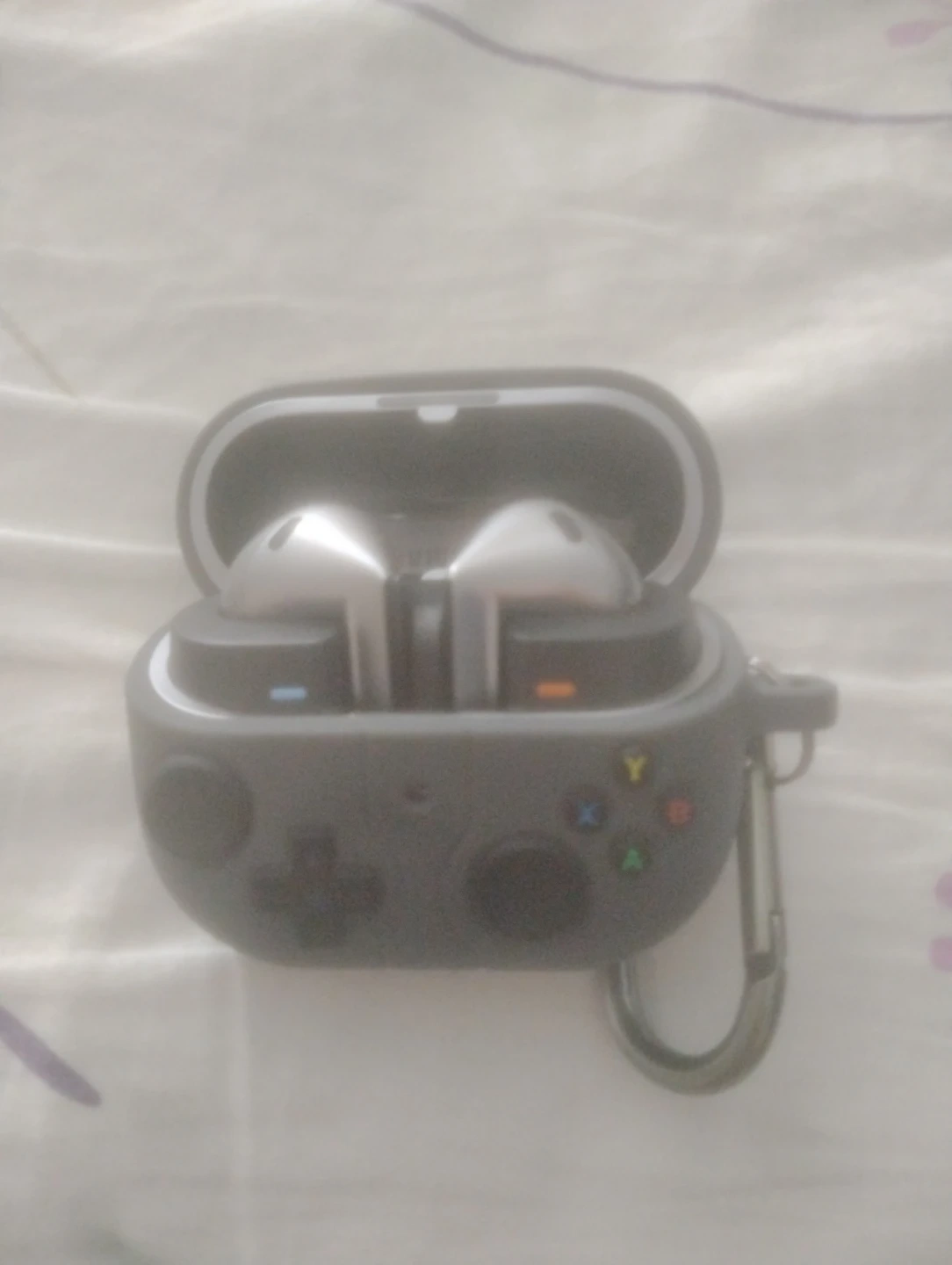 These wireless earbuds come in a fun, game controller-shaped charging case. It's a silicone case with a carabiner clip. These are great for gamers or anyone who wants a unique way to store and charge their earbuds!