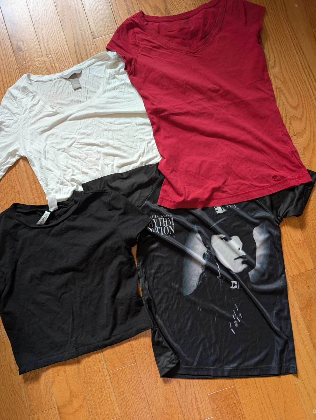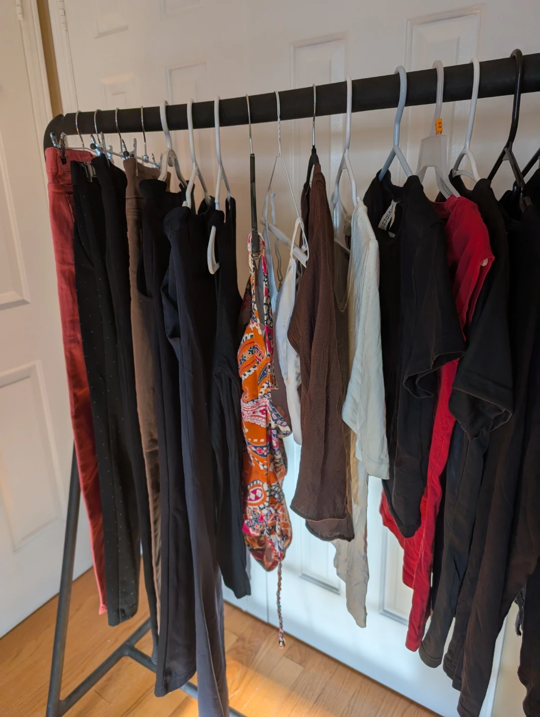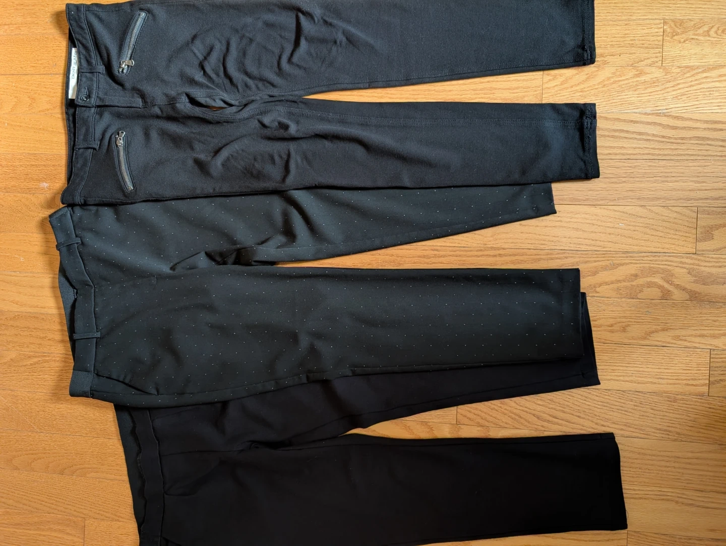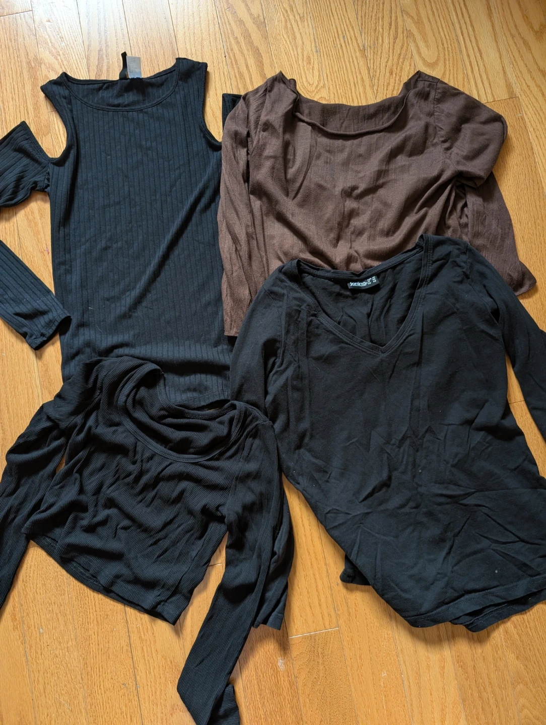 This bundle includes a variety of women's pants and tops in different colours and styles, along with a swimsuit. All items are in good or excellent condition. The price is for the whole bundle, which makes it 50 cents per item 😊