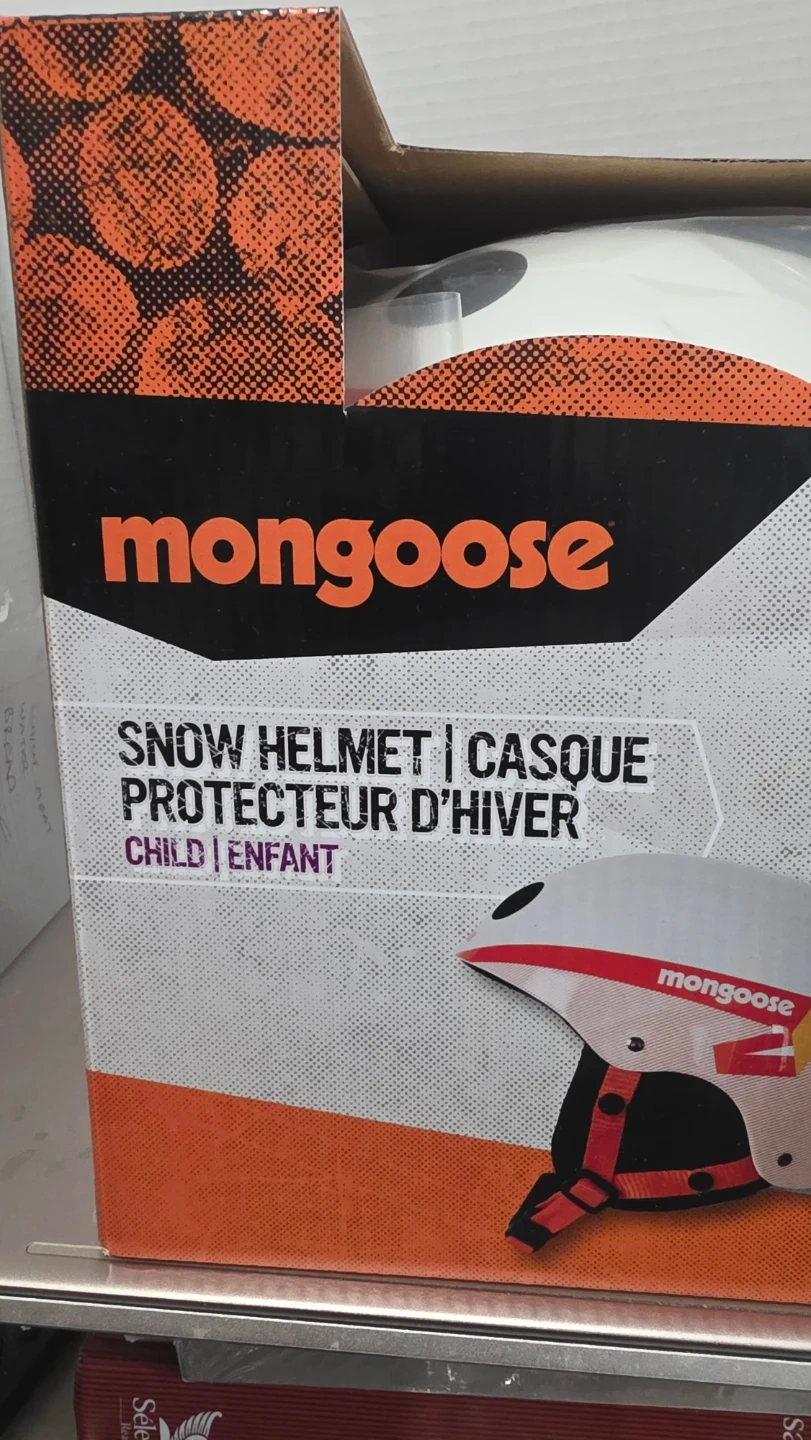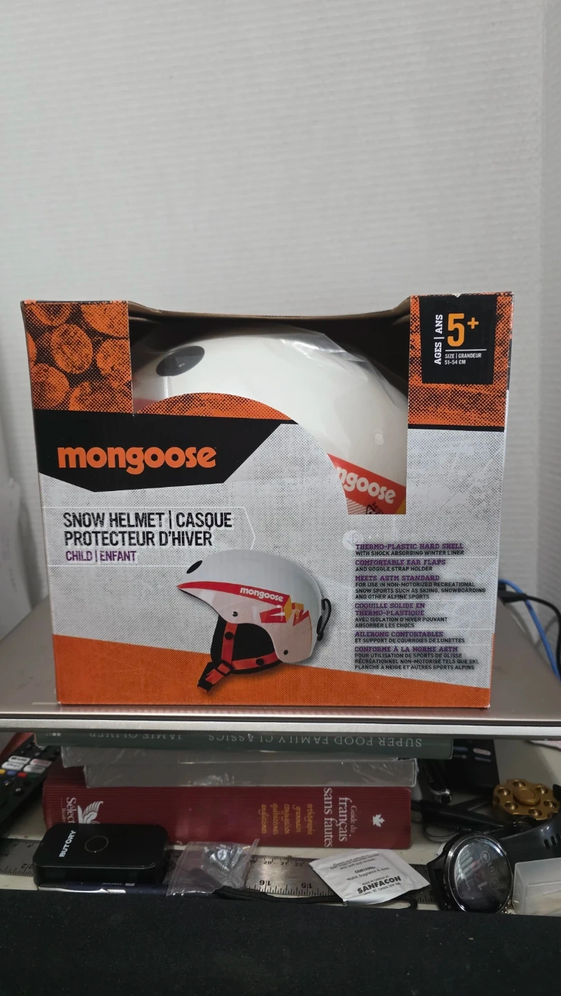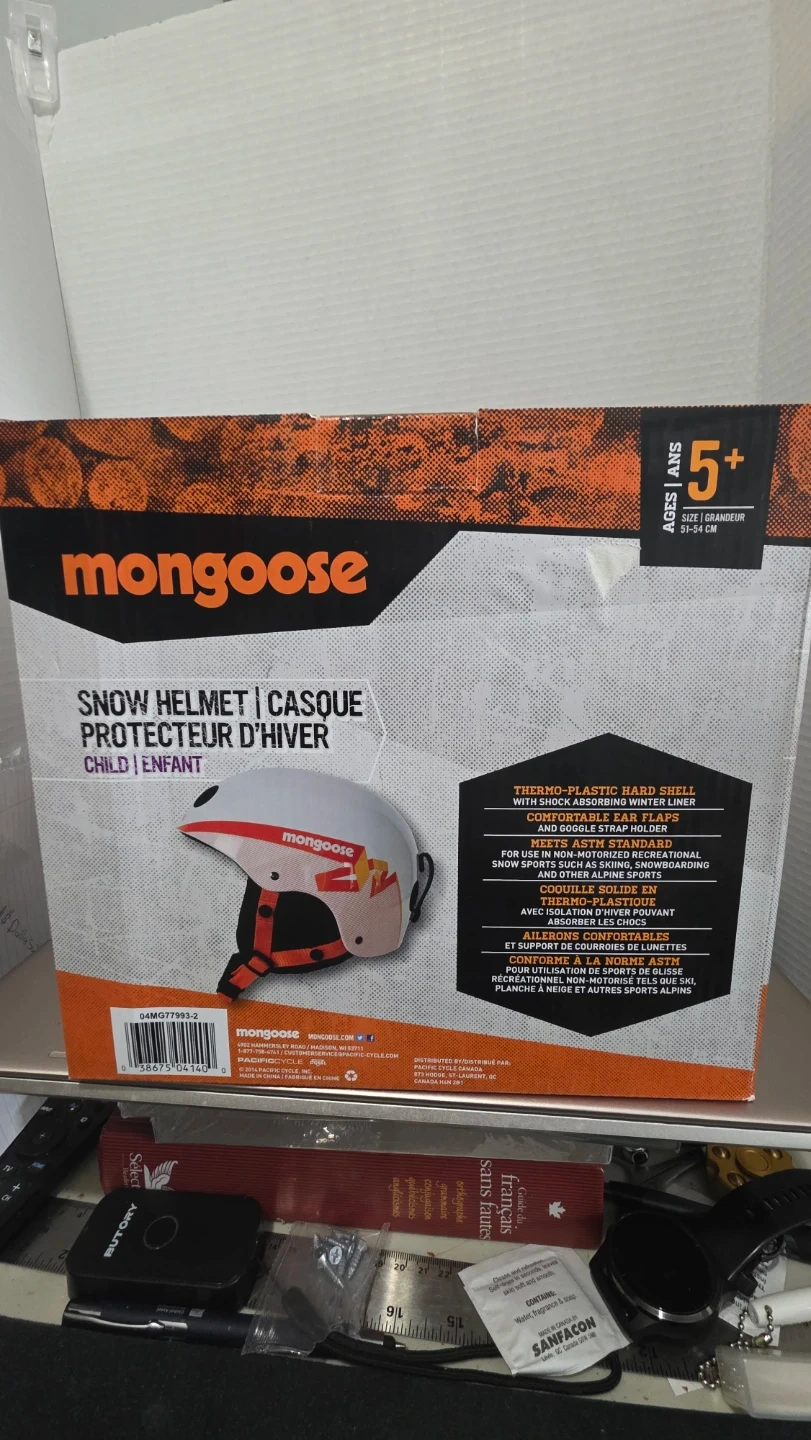 This is a Mongoose child snow helmet for ages 5 and up. It's designed for use in non-motorized recreational skiing, snowboarding, and other alpine sports. The helmet features thermo-plastic hard shells and comfortable ear pads.