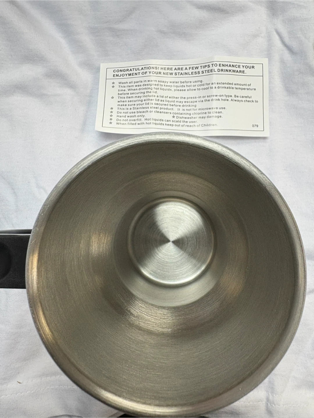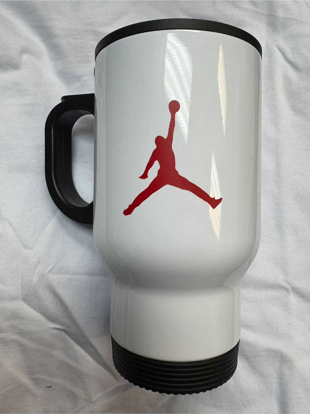 White travel mug featuring the iconic red Jumpman logo. It has a comfortable black handle and a black lid. This mug is perfect for keeping your drinks hot or cold on the go!