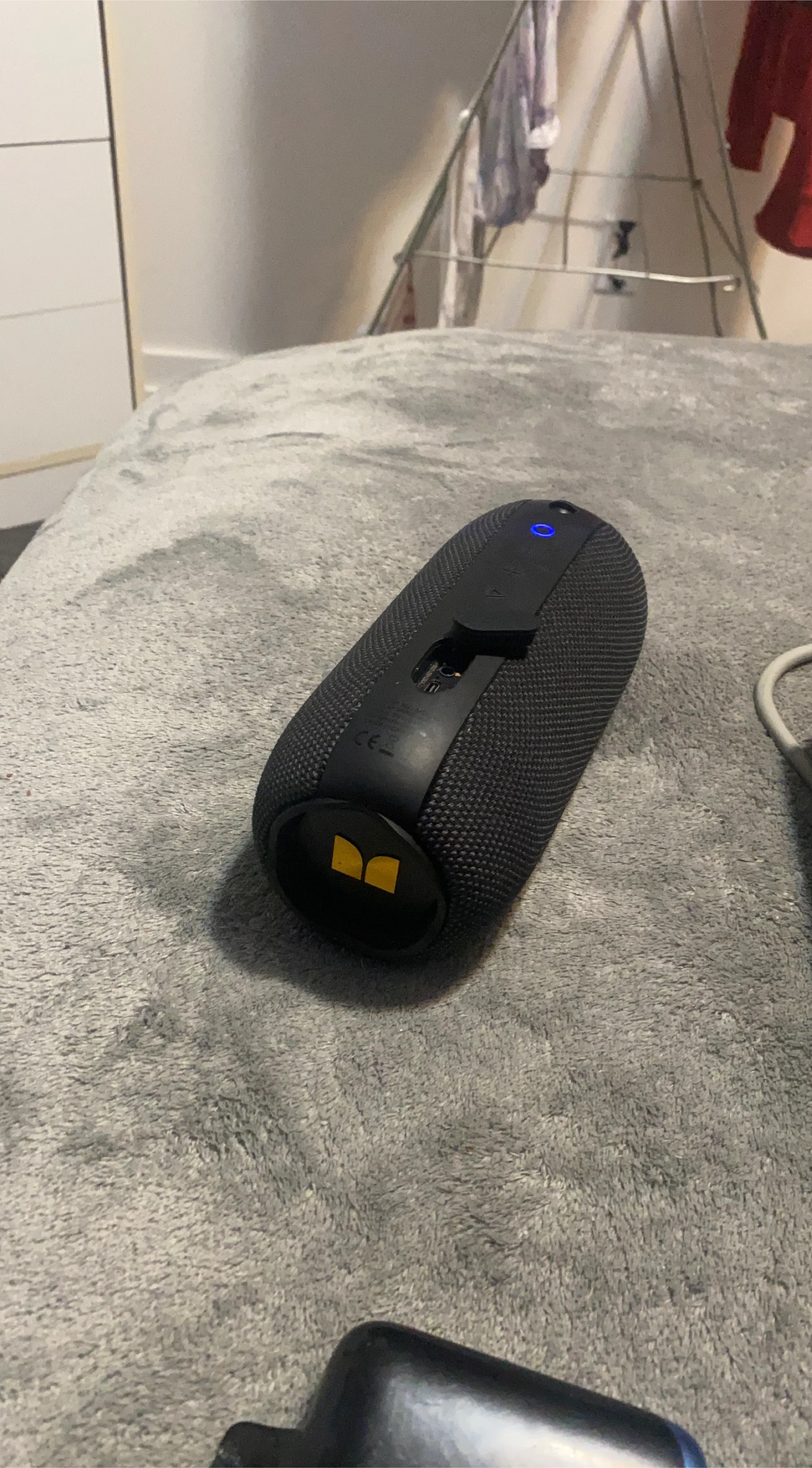 This Monster Superstar Ravebox is a portable Bluetooth speaker. It's black and features a durable, textured fabric exterior. The speaker has a blue LED indicator light on top. Includes original charging cable.