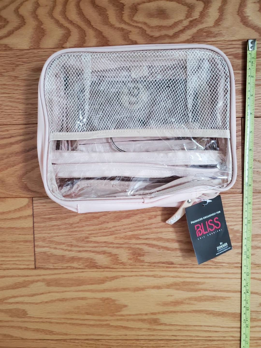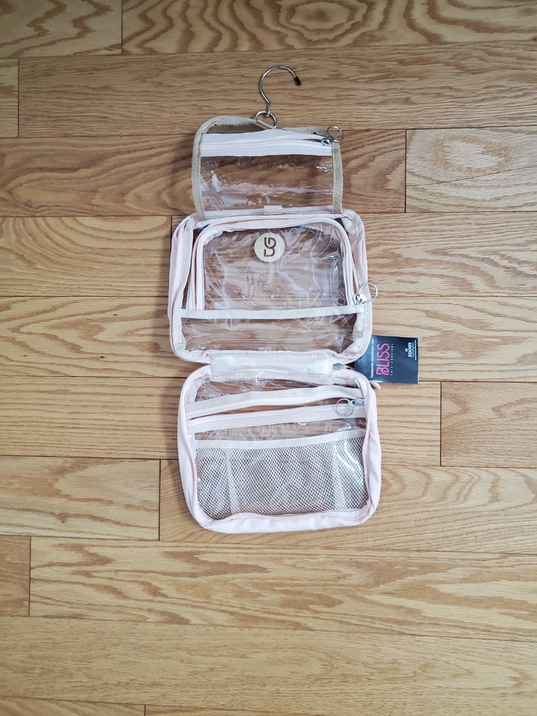 Bliss travel toiletry bag in pink. It's made of fabric and clear plastic with multiple compartments. Features a hook for hanging, perfect for organizing your essentials at home or on the go!