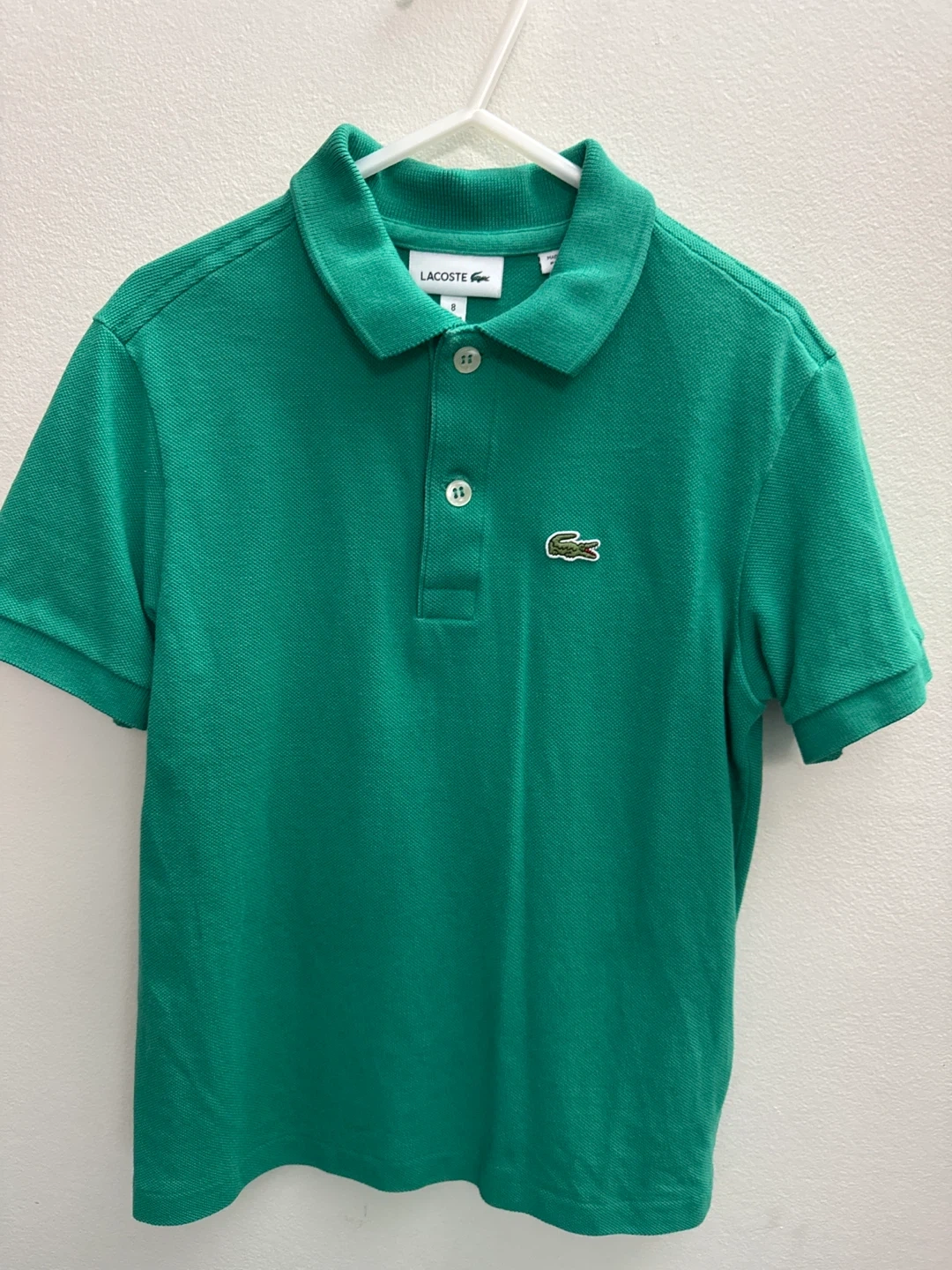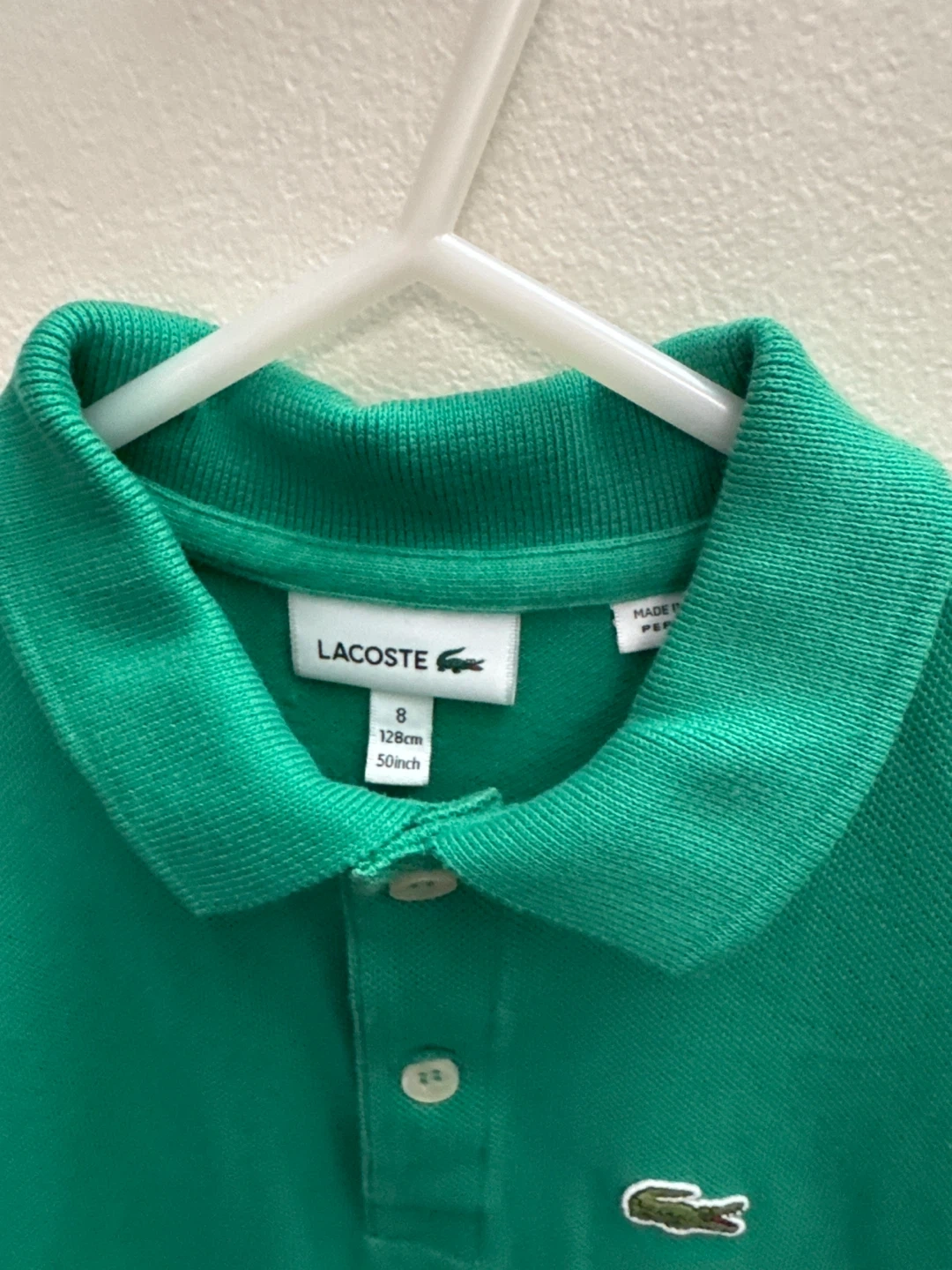 Green Lacoste short-sleeved polo shirt. Features the iconic crocodile logo embroidered on the chest. Made of breathable cotton for comfortable wear. Size 8, suitable for 128cm height.