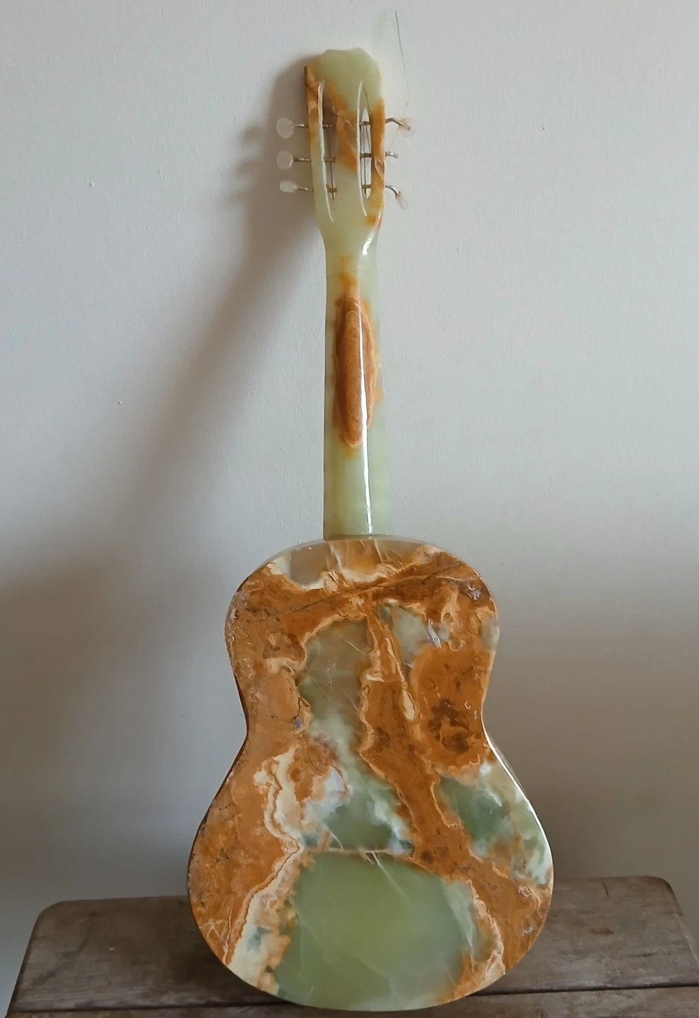 Unique decorative guitar crafted from green and brown onyx. Features intricate marbling and a polished finish. It's a beautiful statement piece for home decor. Perfect for display!