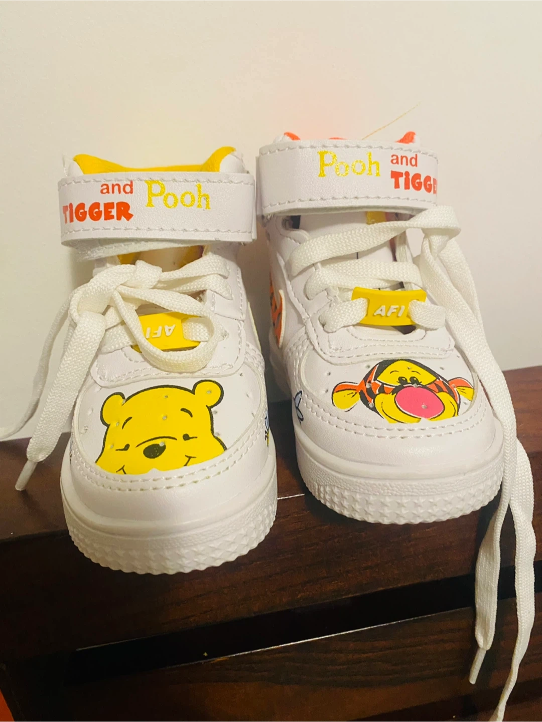 Cute toddler shoes personalized with Winnie the Pooh and Tigger. The inner sole shows size 12. These are white with yellow, orange, and black accents.