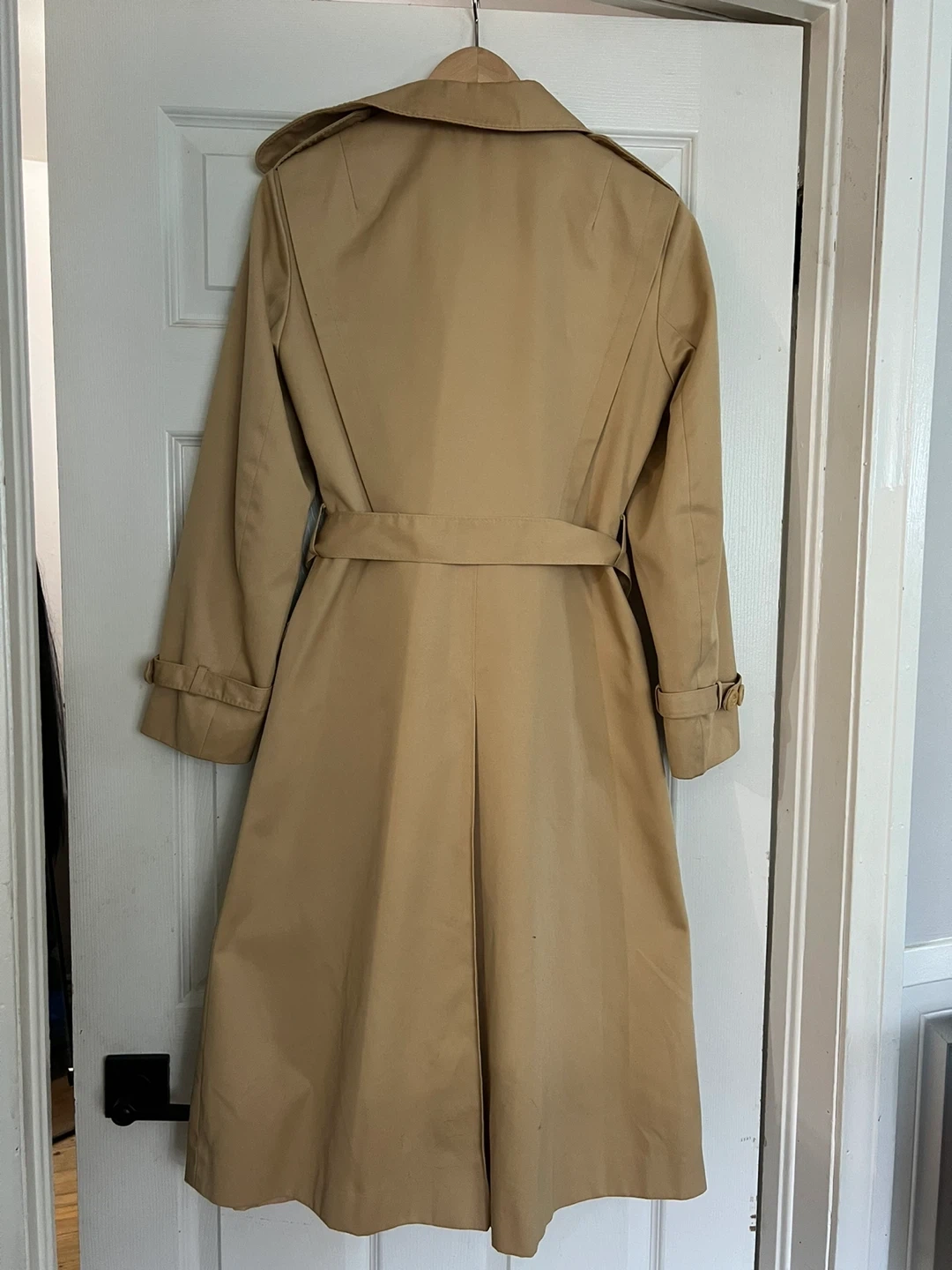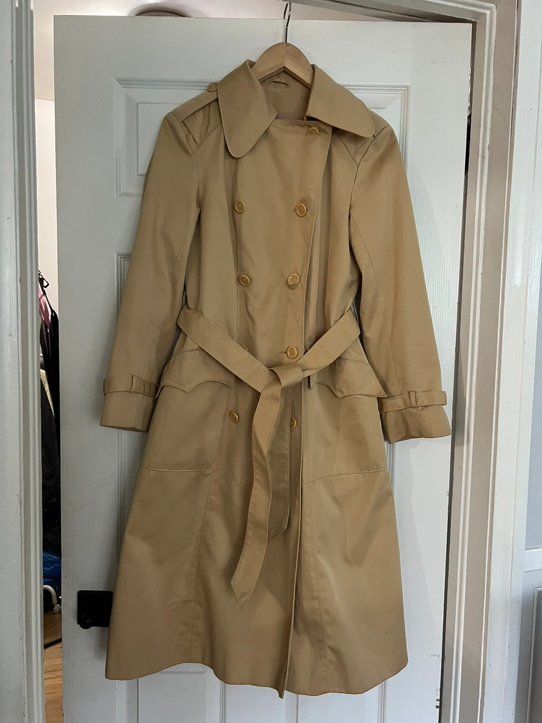 Here's a classic vintage trench coat in a lovely tan colour. It features a double-breasted design with multiple buttons and a belted waist. Perfect for adding a touch of timeless style to your wardrobe! Size 12.