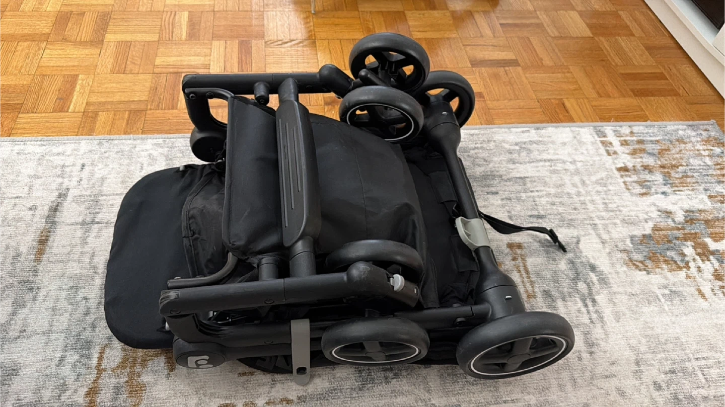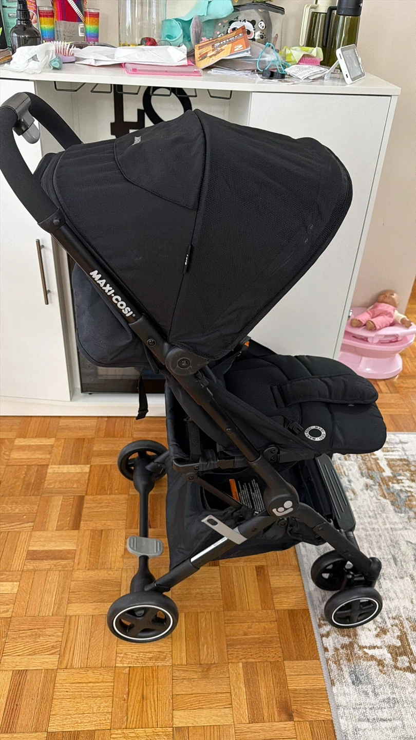 This is a black Maxi-Cosi Lara ultra compact stroller. It's a lightweight and foldable stroller, perfect for travel (fits in cabin) or everyday use.