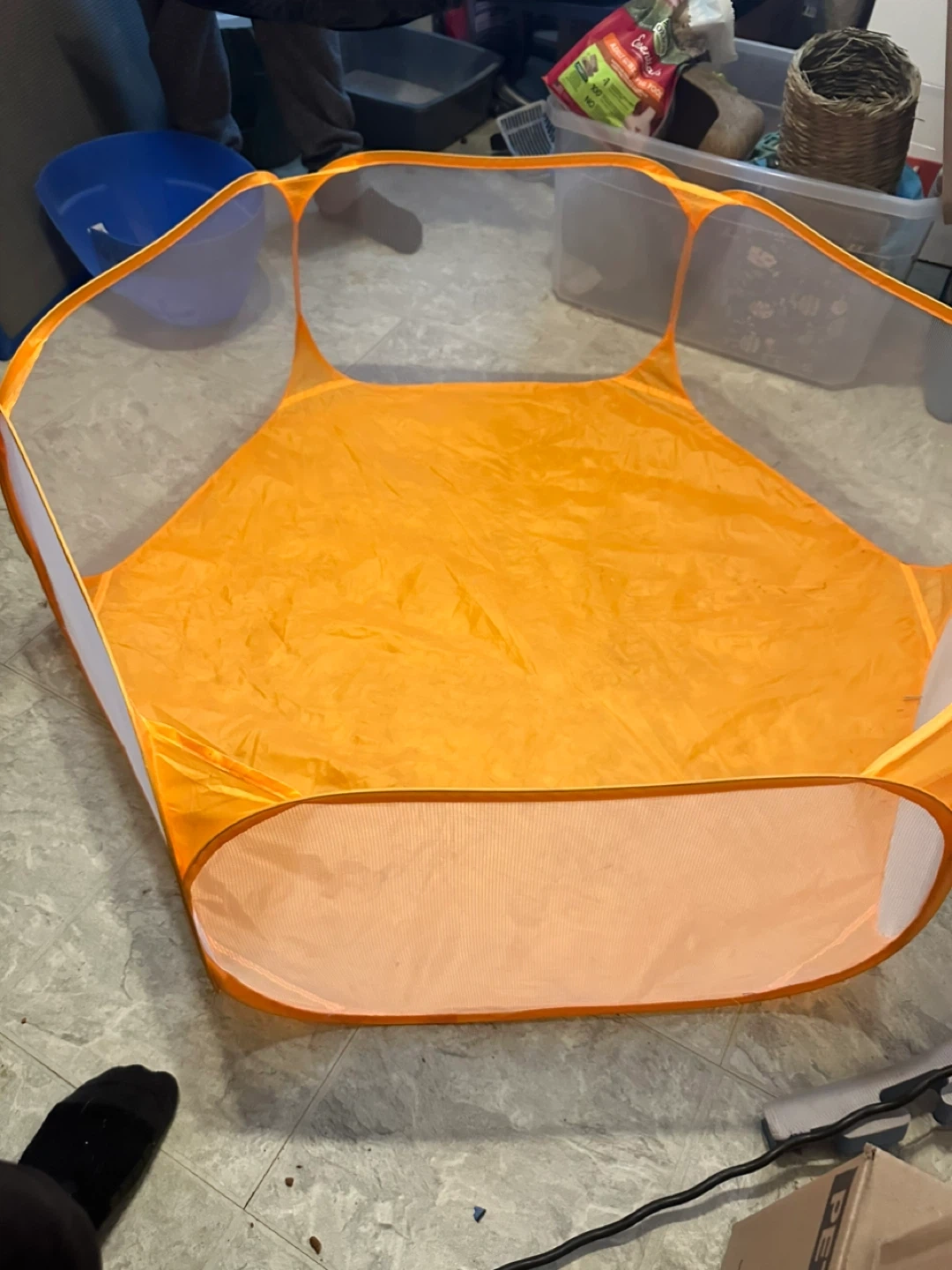 Orange collapsible playpen for small animals. Includes a blue hideout, two tree stump houses, a wooden log tunnel, a carrot-shaped food dish, a small ball, and a green bowl. It's great for giving your small pet some extra room to explore!