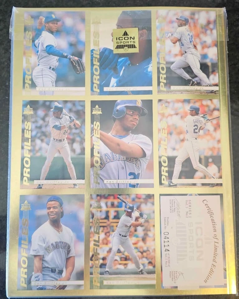 For sale is an original factory sealed Icon Sports Profiles Magazine of Ken Griffey Jr. This is a premium Gold embossed Collectors edition issue. Volume 1 Series 1 Number 2. Comes with certification and serial number. Uncut sheet of 9 cards on back cover. From original box in Mint condition.
