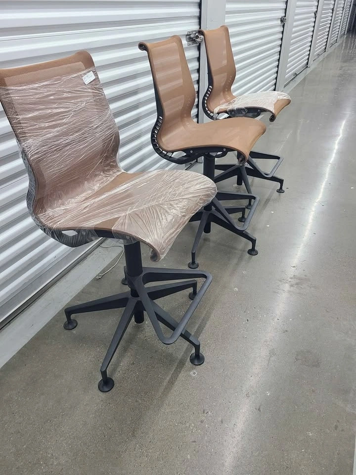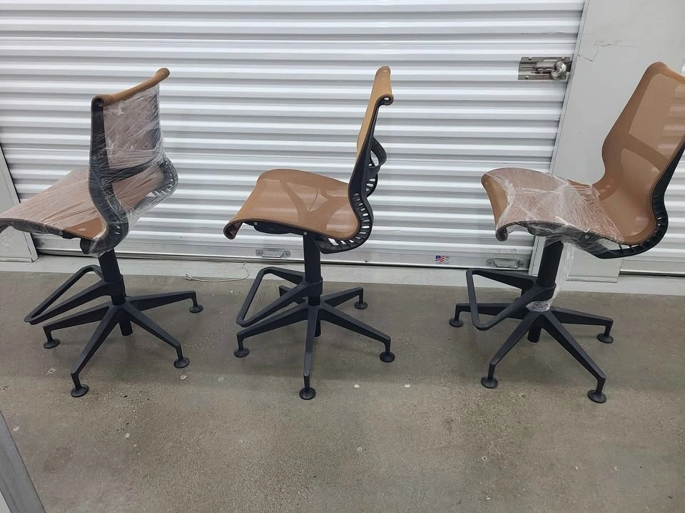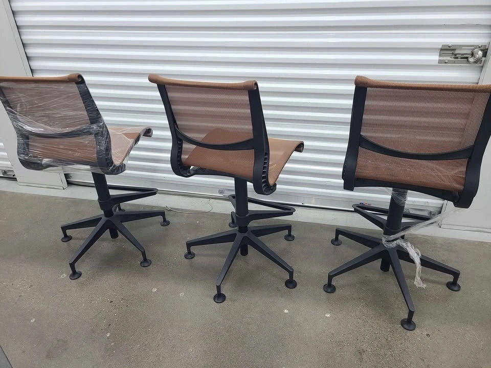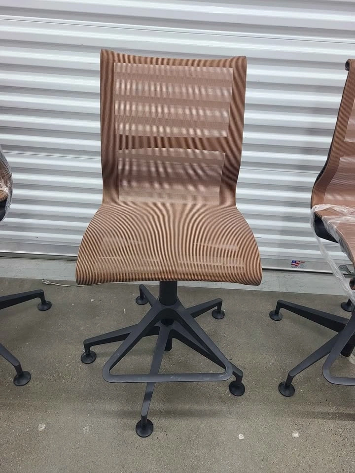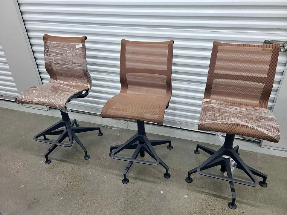 - 1 pre-owned at $200. These are Herman Miller Setu armless stools, high-end office furniture. They feature a graphite tone base with a footrest and spice brown mesh. Designed by Studio 7.5, the 'Kinematic Spine' supports movement without complex adjustments. The Lyris 2 suspension material distributes weight evenly and provides aeration. Pickup in Downtown Toronto near Adelaide Street.