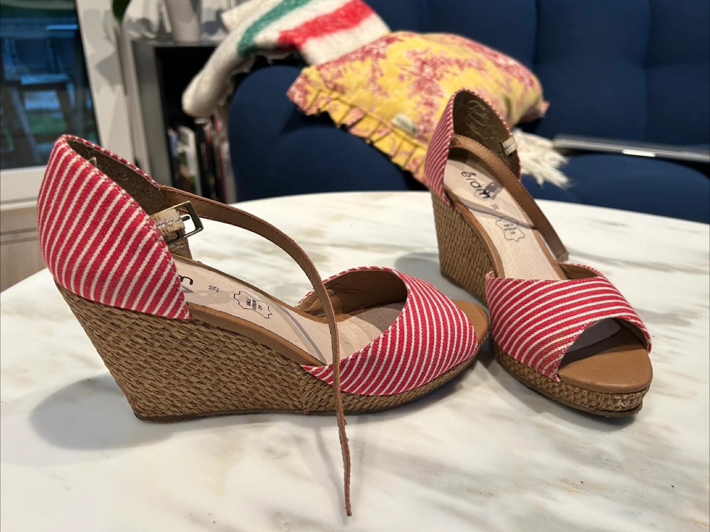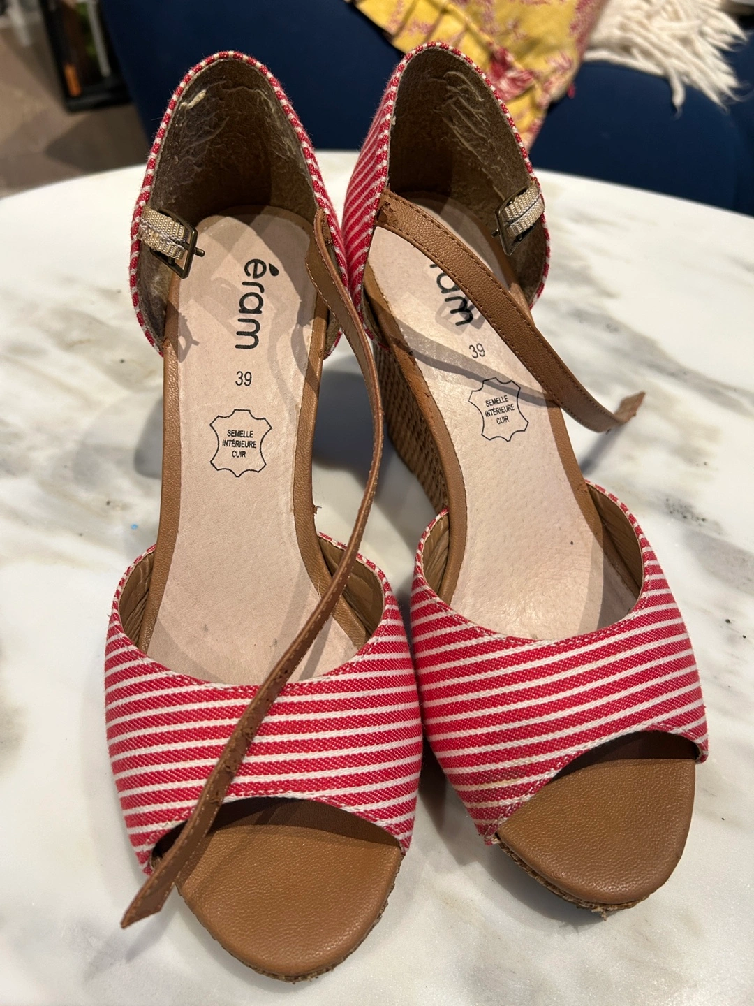 Cute and chic red and white stripes wedge heels with ankle straps. The platform heels make them super comfortable! Size 39. From French brand Eram. Leather sole.