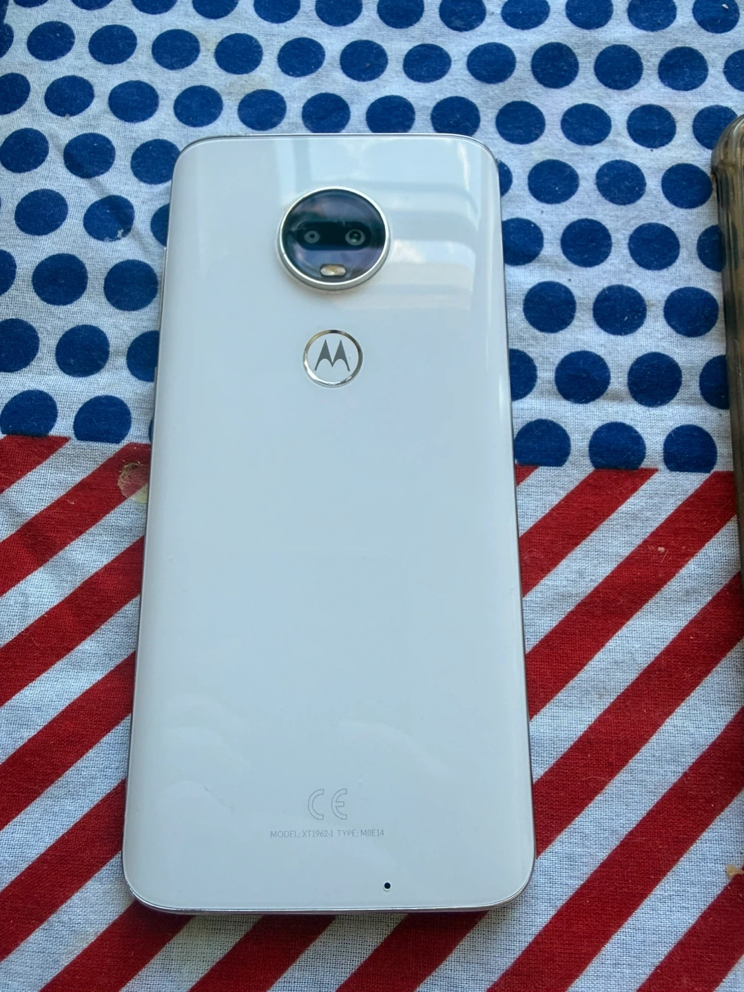 Selling a white Motorola Moto G7 Play smartphone. It's a reliable device for everyday use. Includes a clear protective case with an American flag design. Phone model XT1952-1.