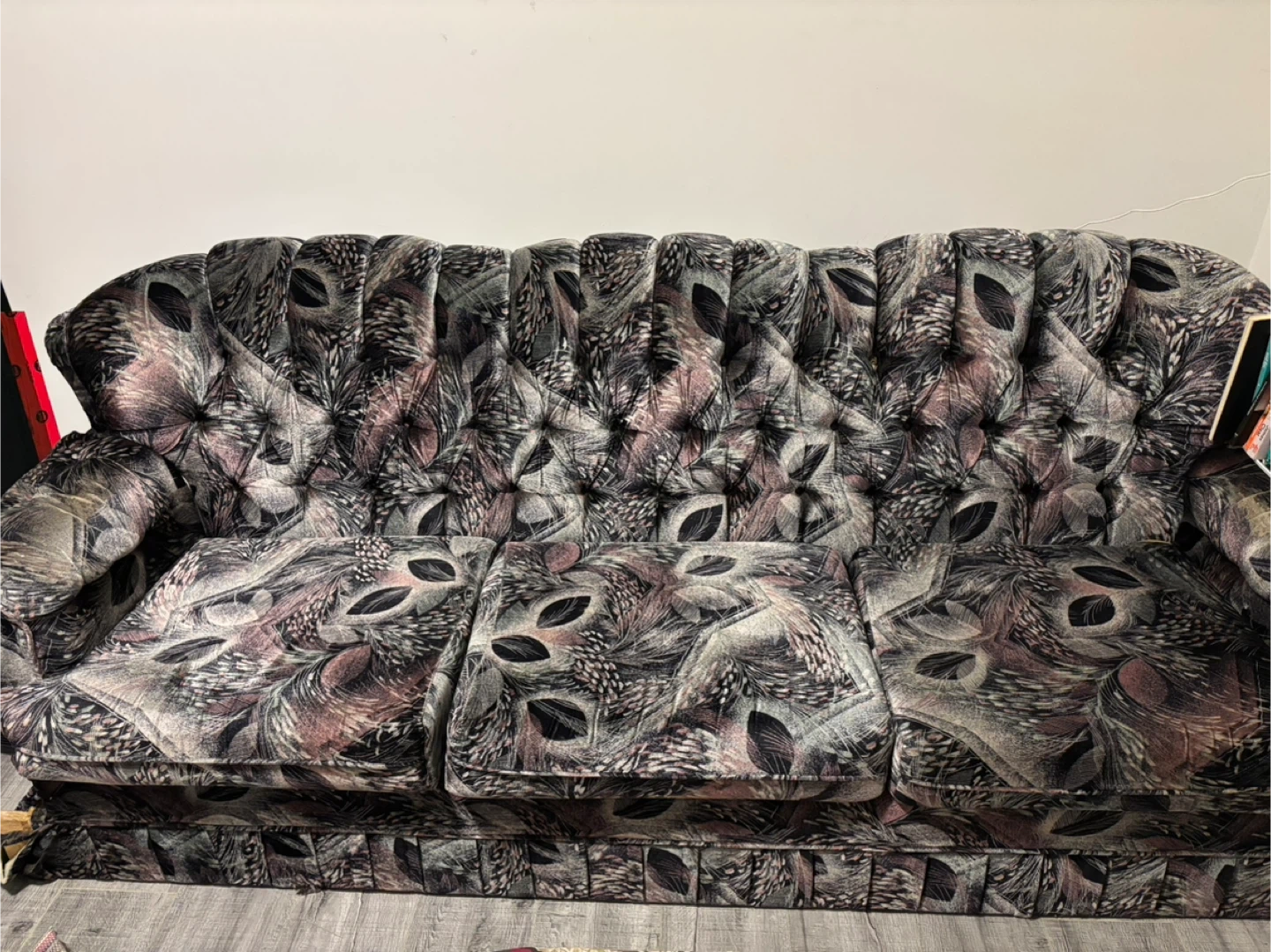 This is a tufted sofa with a patterned fabric. It has a classic design with button tufting along the back and seat cushions. The fabric features a repeating feather or leaf motif in various shades of grey, purple, and beige. It appears to be a three-seater couch. This sofa would add a vintage touch to a living space.