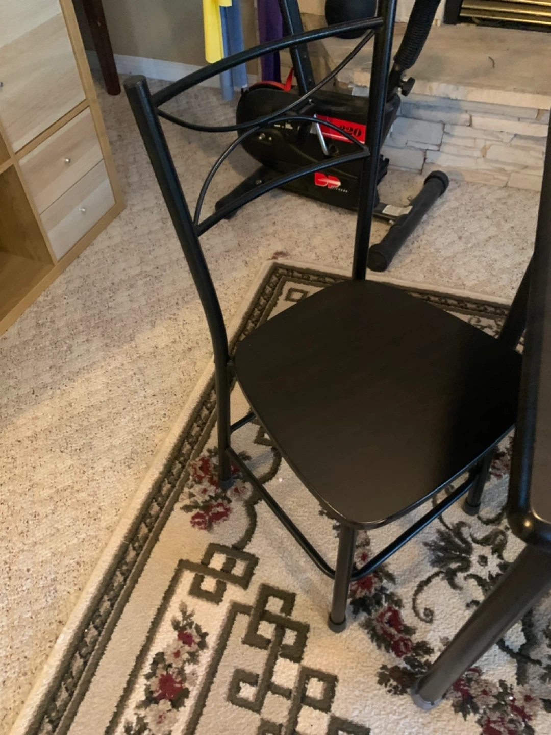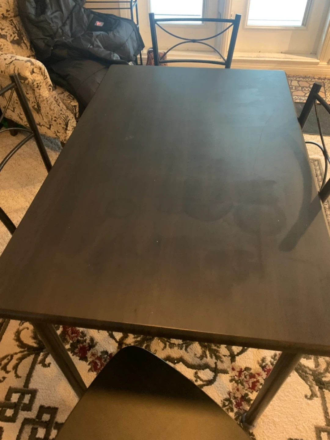 A black dining table set with four chairs. The table has a dark finish and metal legs. The chairs are also black with metal frames and curved backs. This set is suitable for a small dining area or kitchen nook. It's a functional addition to any home! No marks or scratches. Pick up only.