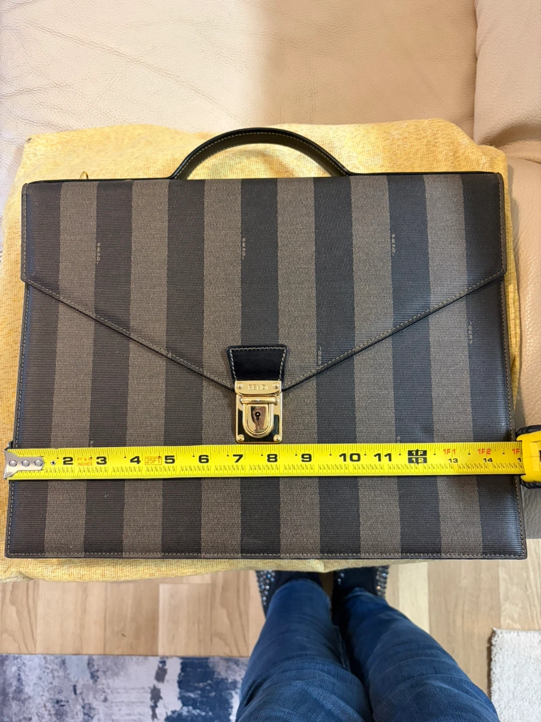 Vintage Fendi briefcase in classic brown and black monogram stripe. It's made of durable coated canvas with leather trim and features a secure lock closure. Comes with an adjustable shoulder strap for versatile carrying, key and lock. Includes dust cover.