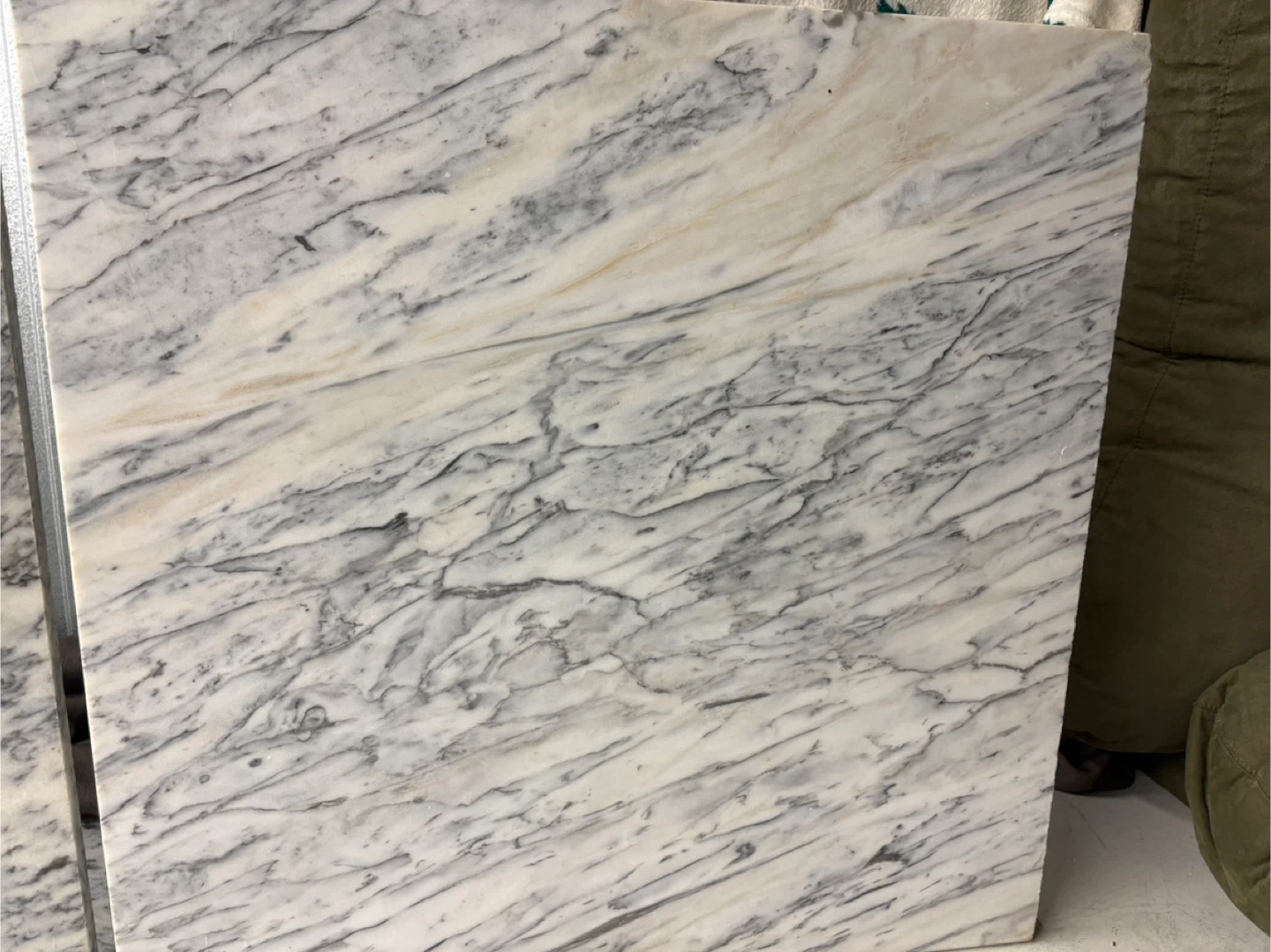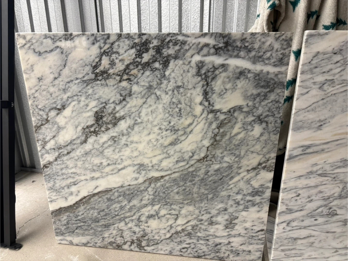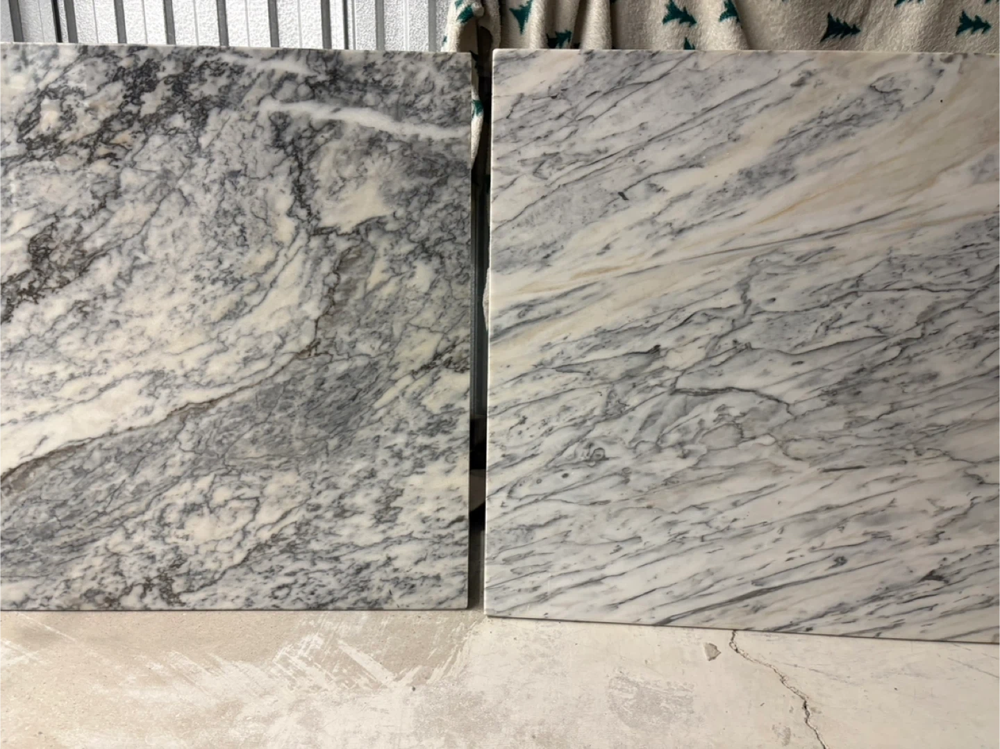 Note the beautiful organic variance between the two supports. The left features a dramatic, high-movement Vagli grain, while the right offers a more serene, airy selection of the same stone. This mismatch is the hallmark of custom, non-mass-produced furniture and highlights the unique natural origin of the Arabescato Vagli marble