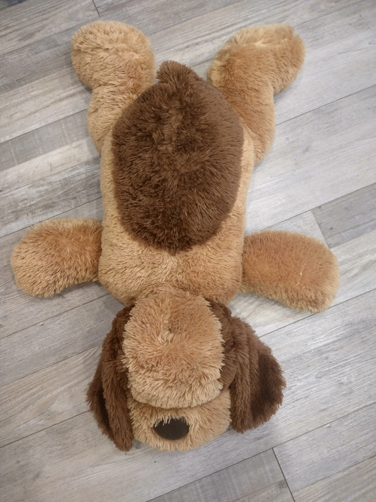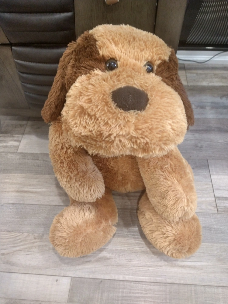 Puppy dog plush toy in shades of brown. NO PETS, NO SMOKING HOUSE. It's pretty clean, no stains, no marks . but you can always wash it before giving to your kids. Features a round nose and large floppy ears. You could snuggle this for a relaxing evening.