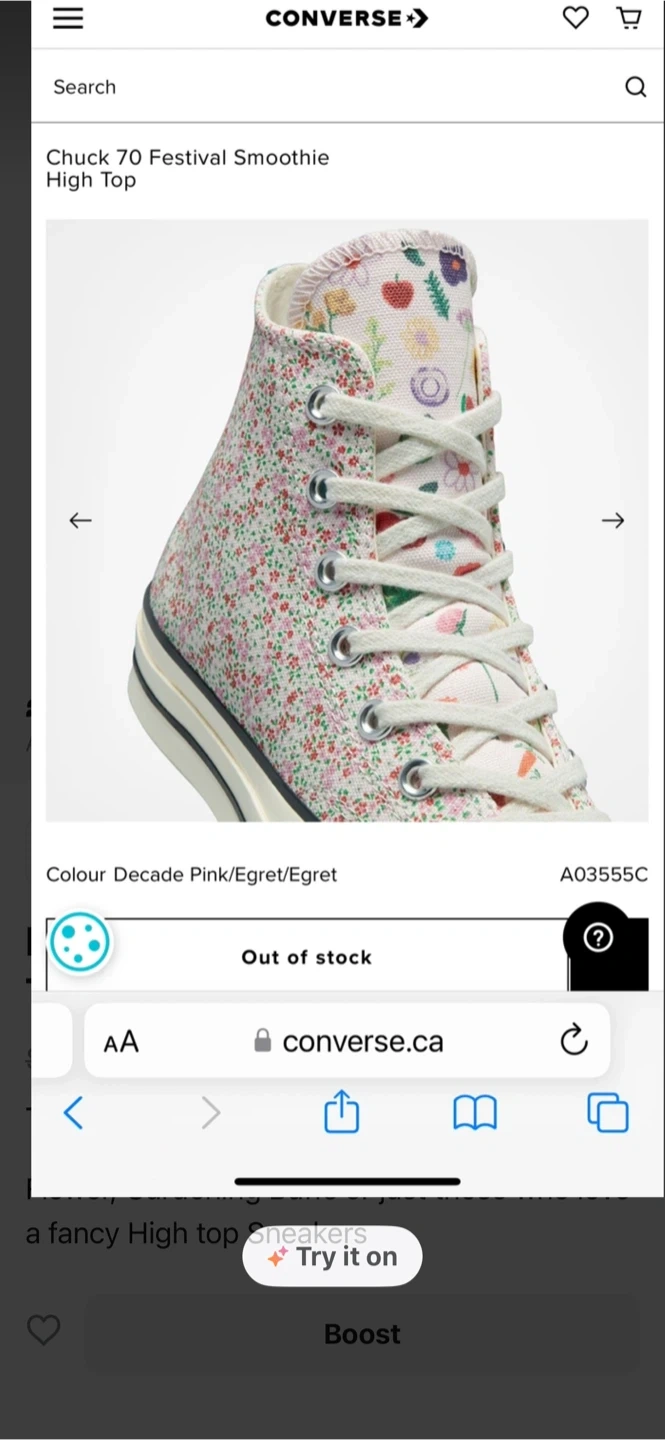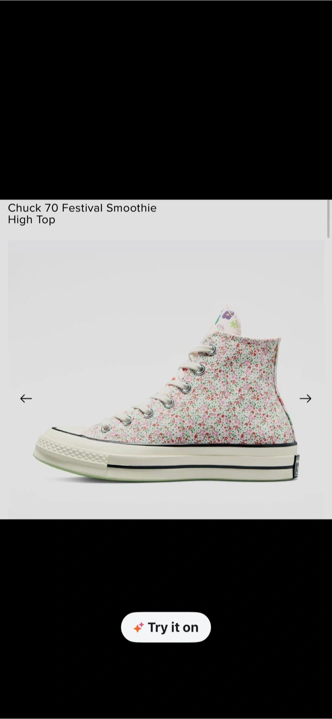 These Converse Chuck 70 sneakers feature a 'Decade Pink/Egret' colourway with a fun floral print. They're high-top style with classic Chuck Taylor details. Perfect for adding a playful touch to any outfit!