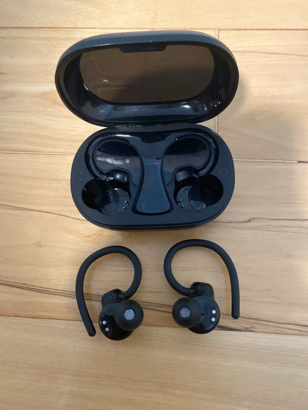 Wireless earbuds in black. They come with a charging case that displays battery percentage. The earbuds feature an over-ear hook design for secure fit. Includes charging cable.