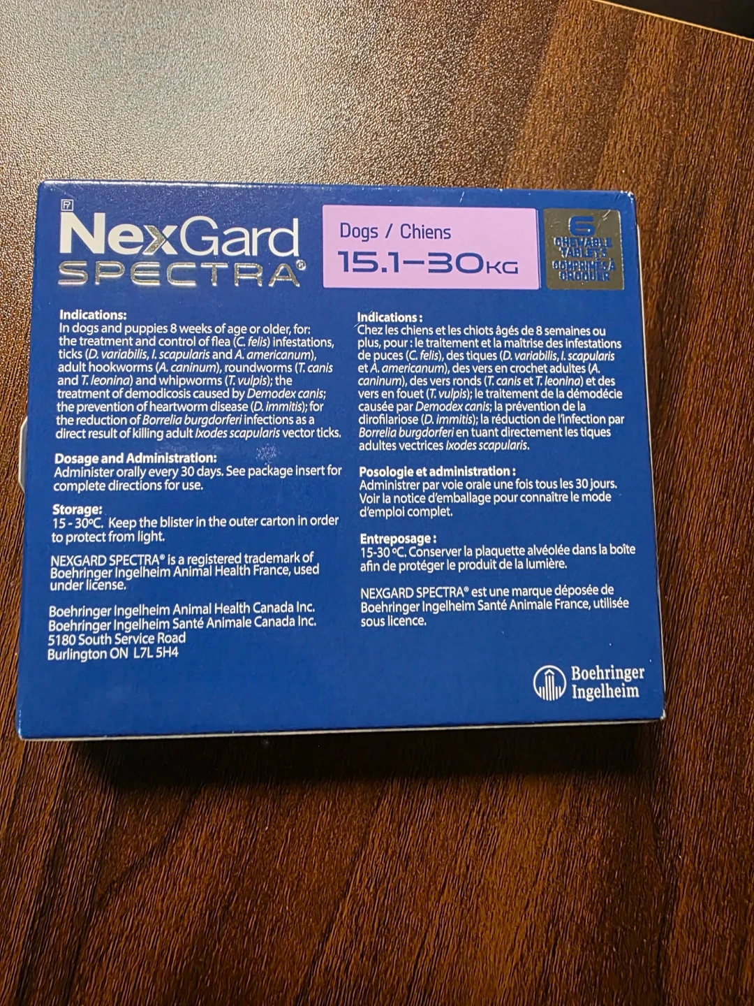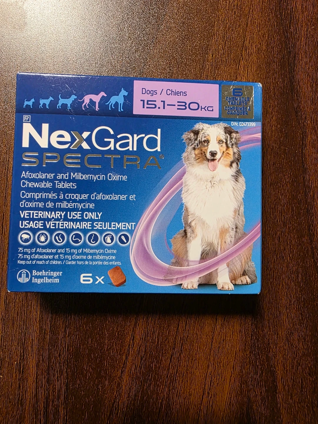 NexGard Spectra chewable tablets for dogs weighing 15.1-30KG. Expiry date is October 2027. VETERINARY USE ONLY. These tablets treat and prevent fleas, ticks, heartworm, and intestinal worm infections.