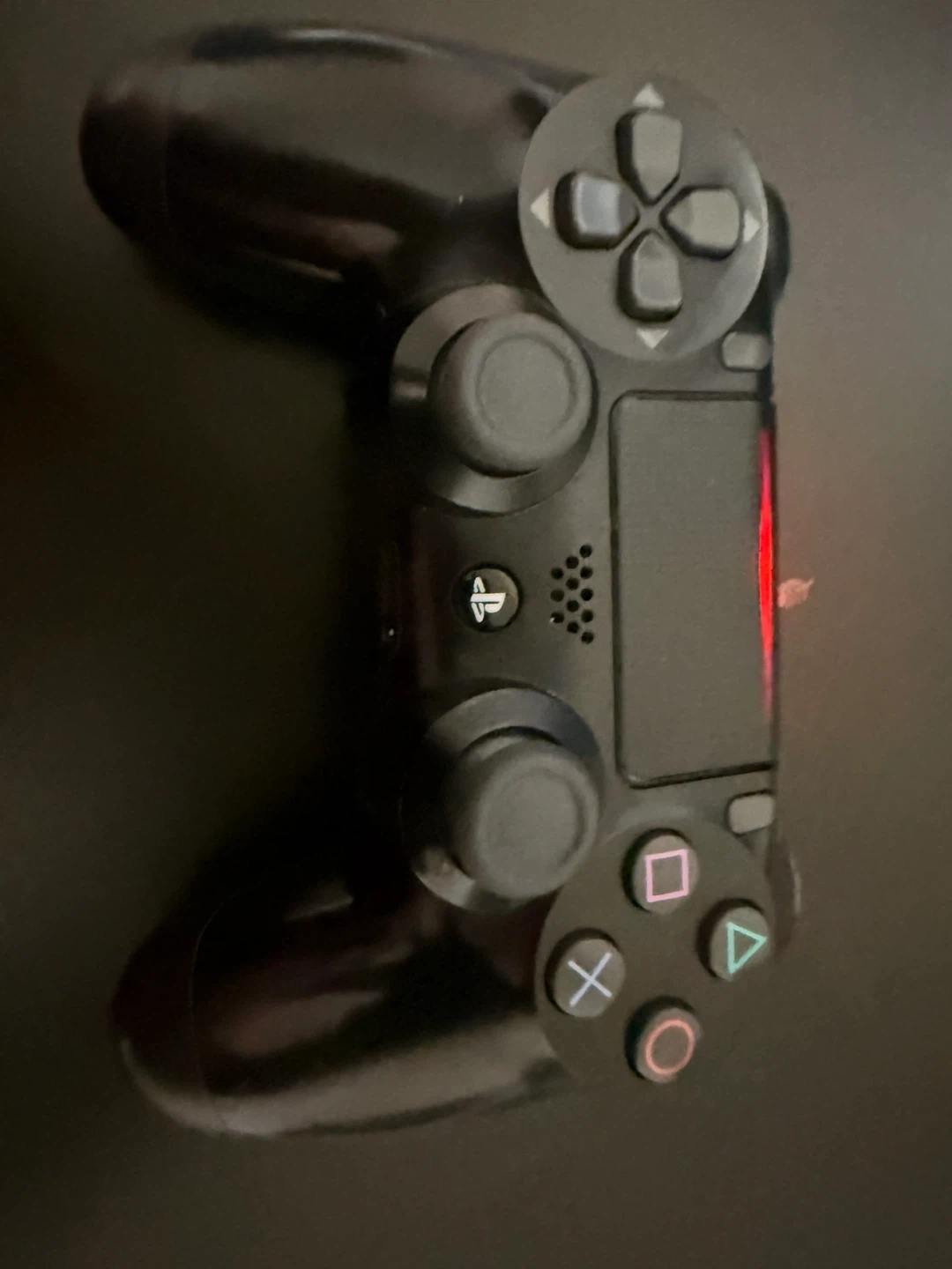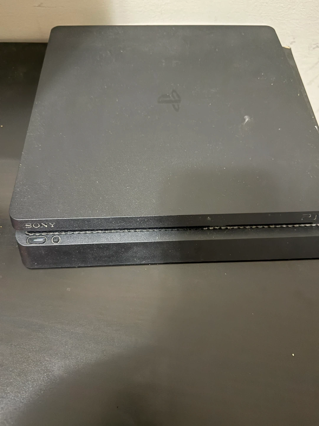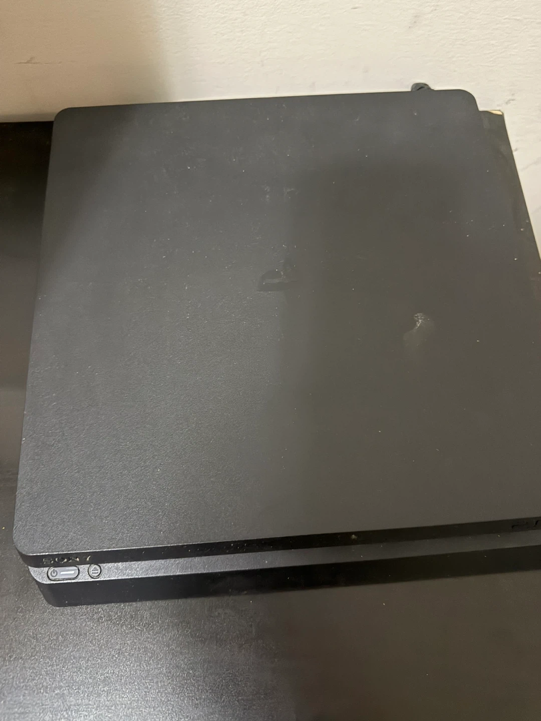 This is a black Sony PlayStation 4 Slim console. It comes with a DualShock 4 controller. Perfect for gaming nights!