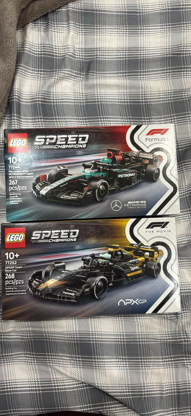 Two sealed LEGO Speed Champions sets featuring F1 race cars. Set 77244 is the Mercedes-AMG PETRONAS F1 Team W15 E Performance with 267 pieces. Set 77252 is the APXGP Team Race Car with 268 pieces.