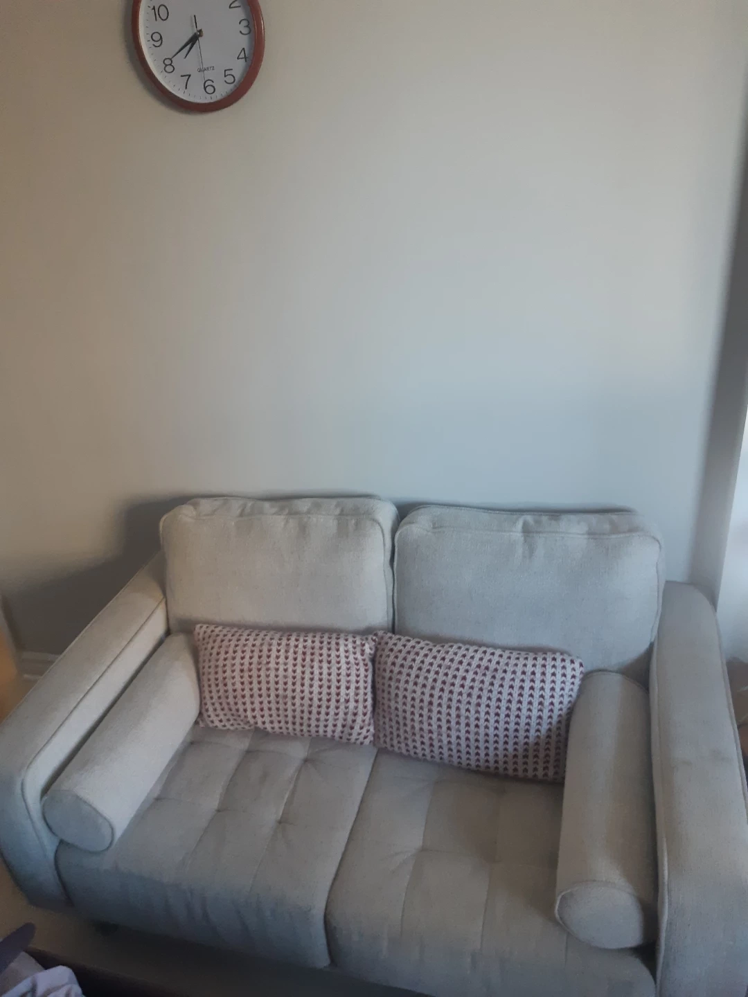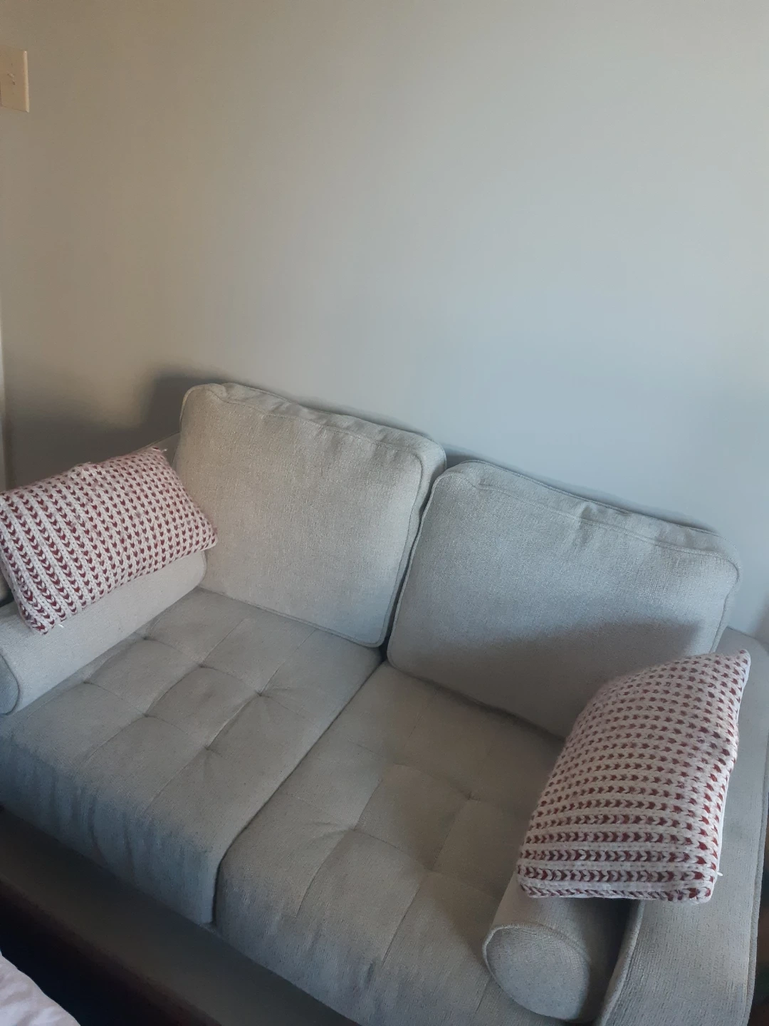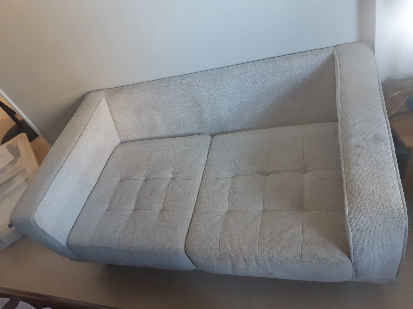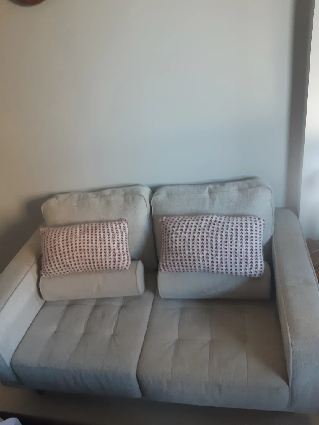 Two-seater sofa, light beige fabric. Includes two matching pillows. Button tufting detail. Simple, modern design. Great for small spaces.