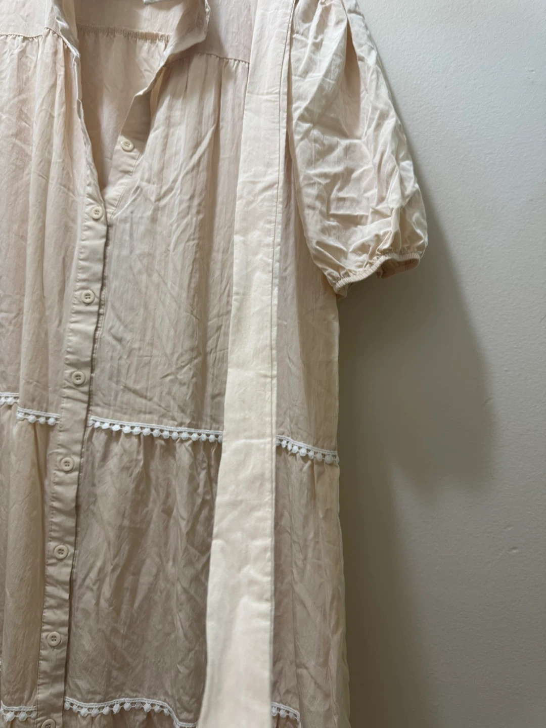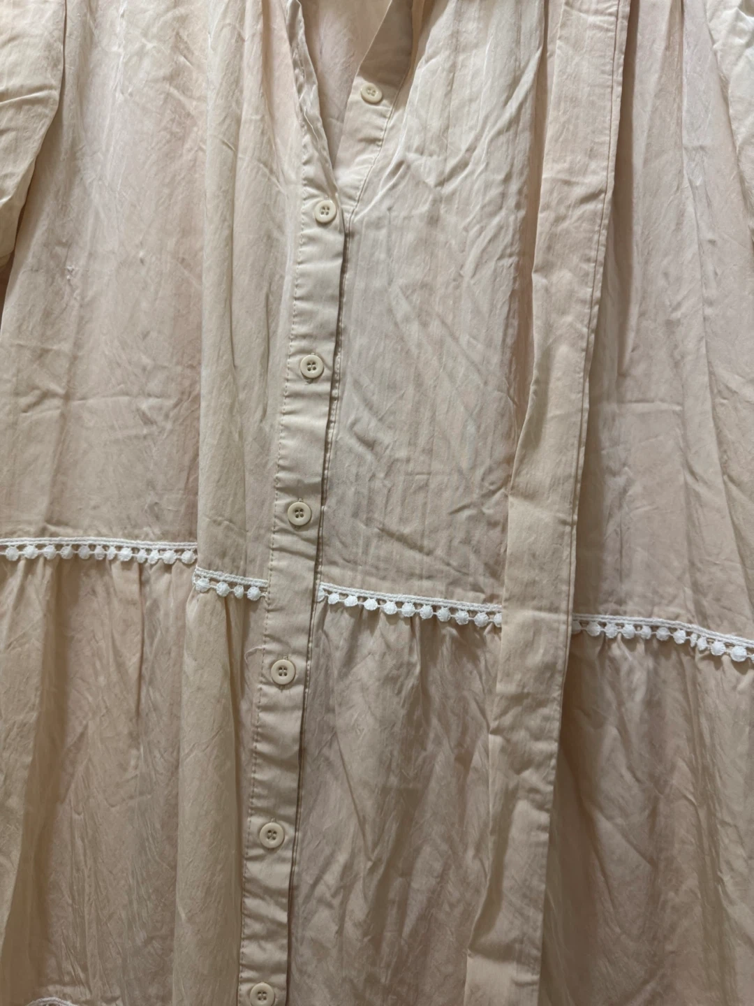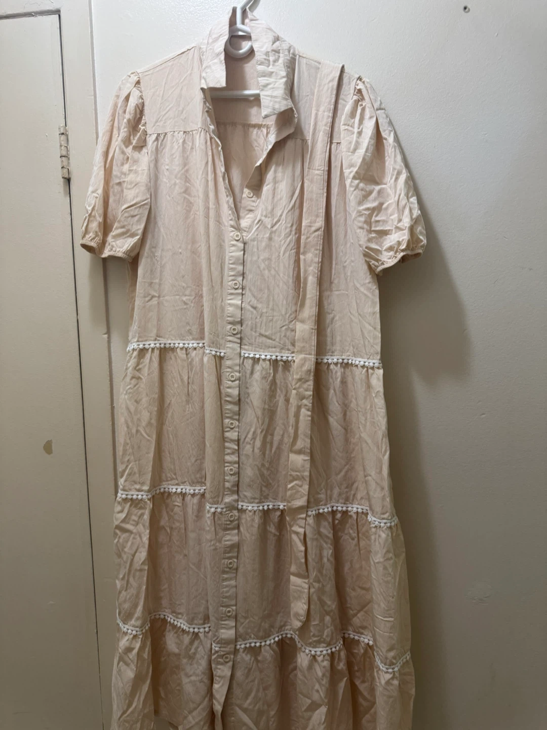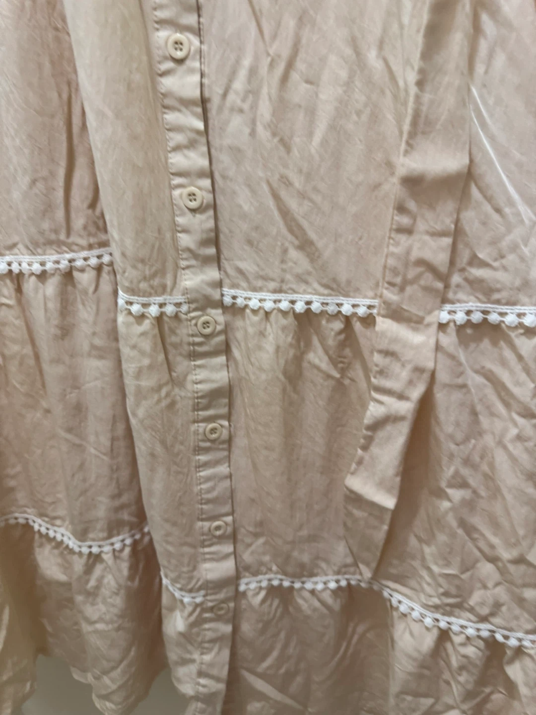 A lovely off white tiered dress! It features a button-down front and delicate white trim. Perfect for a casual day out or a summer evening. In great condition!