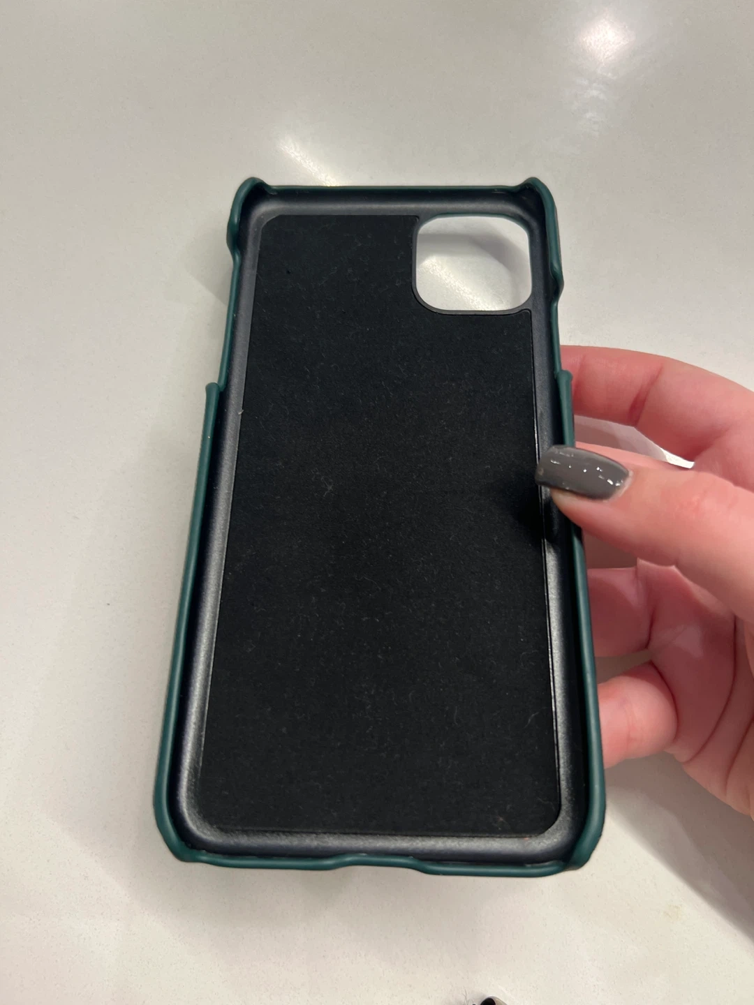 This Roxan phone case is designed for iPhone 12 and 12 Pro. It's made from green vegan leather with a textured finish. The interior is lined with soft microfiber.