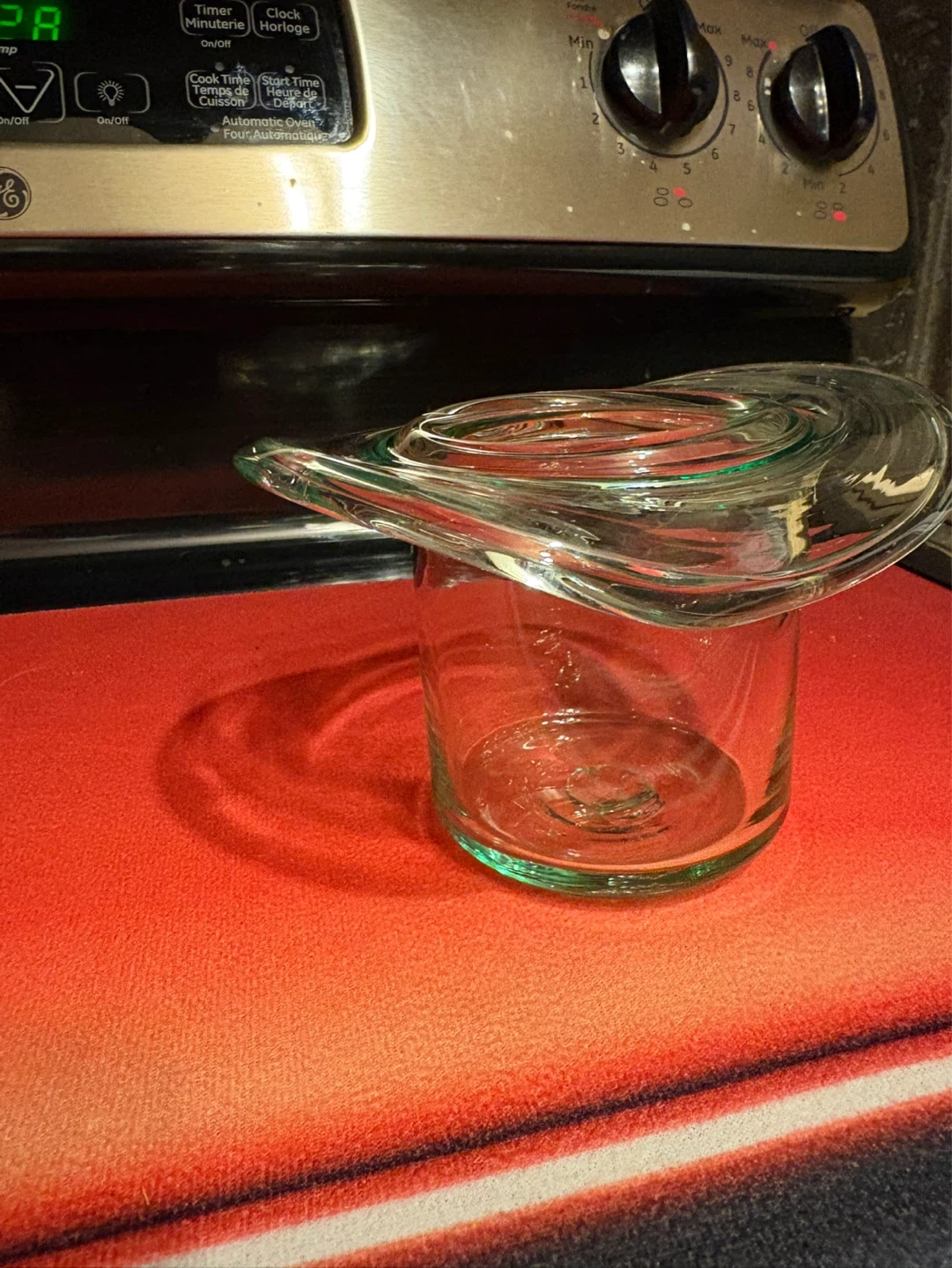 Glass votive candle holder with a unique wide-brimmed design. Clear glass . It's perfect for adding a decorative touch to any room.