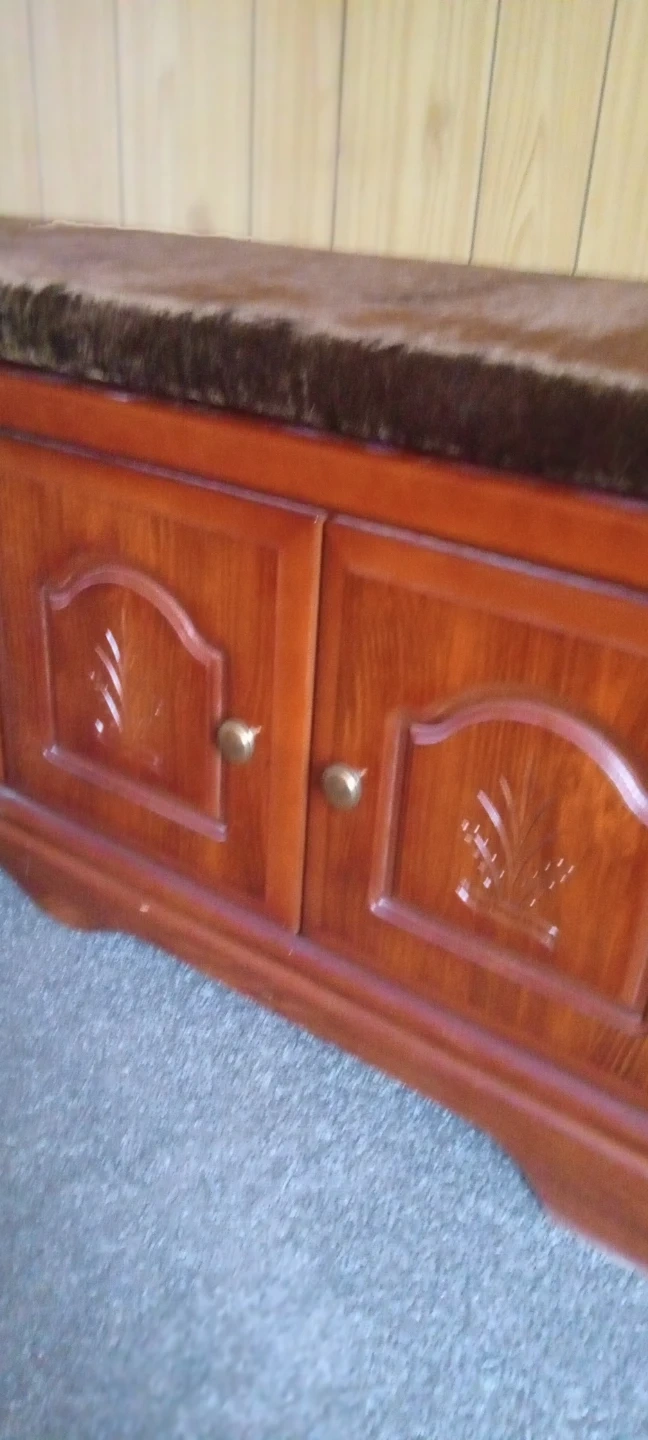 This wooden hope chest features a plush, dark brown upholstered seat, offering comfortable seating and cedar lined inside,lots of storage room good for putting at the end of your bed for blankets