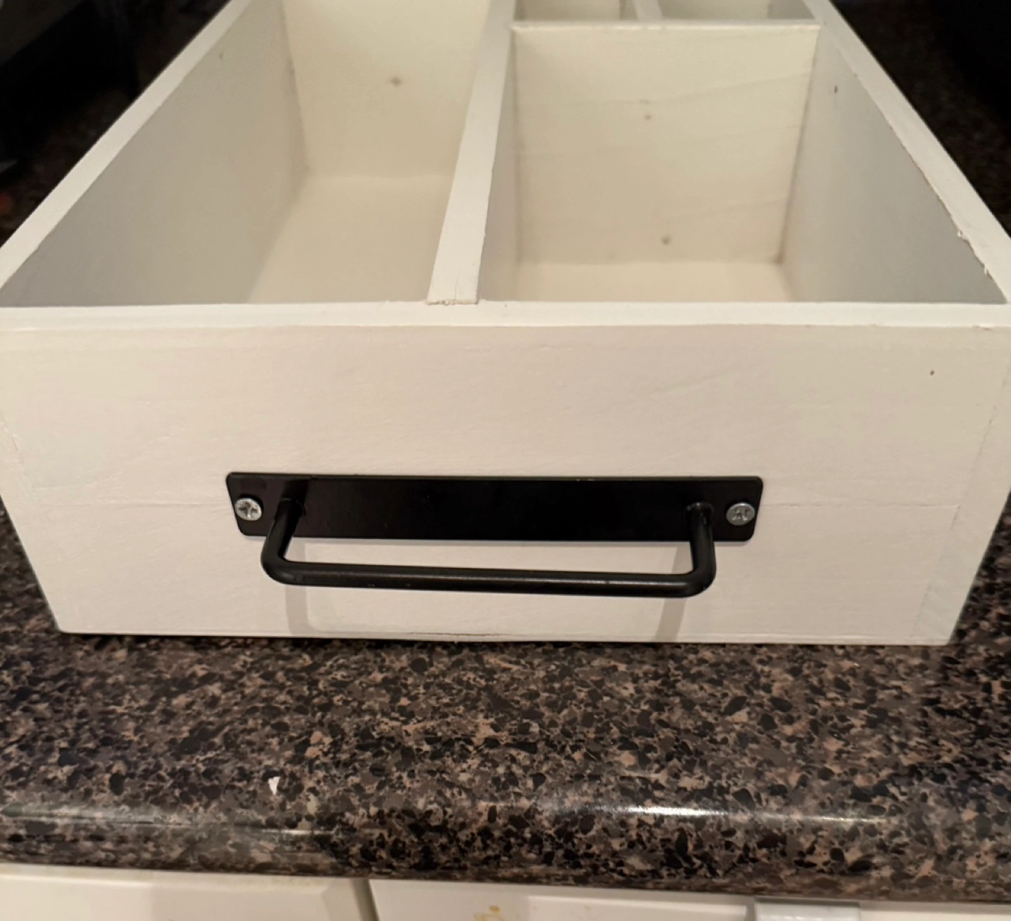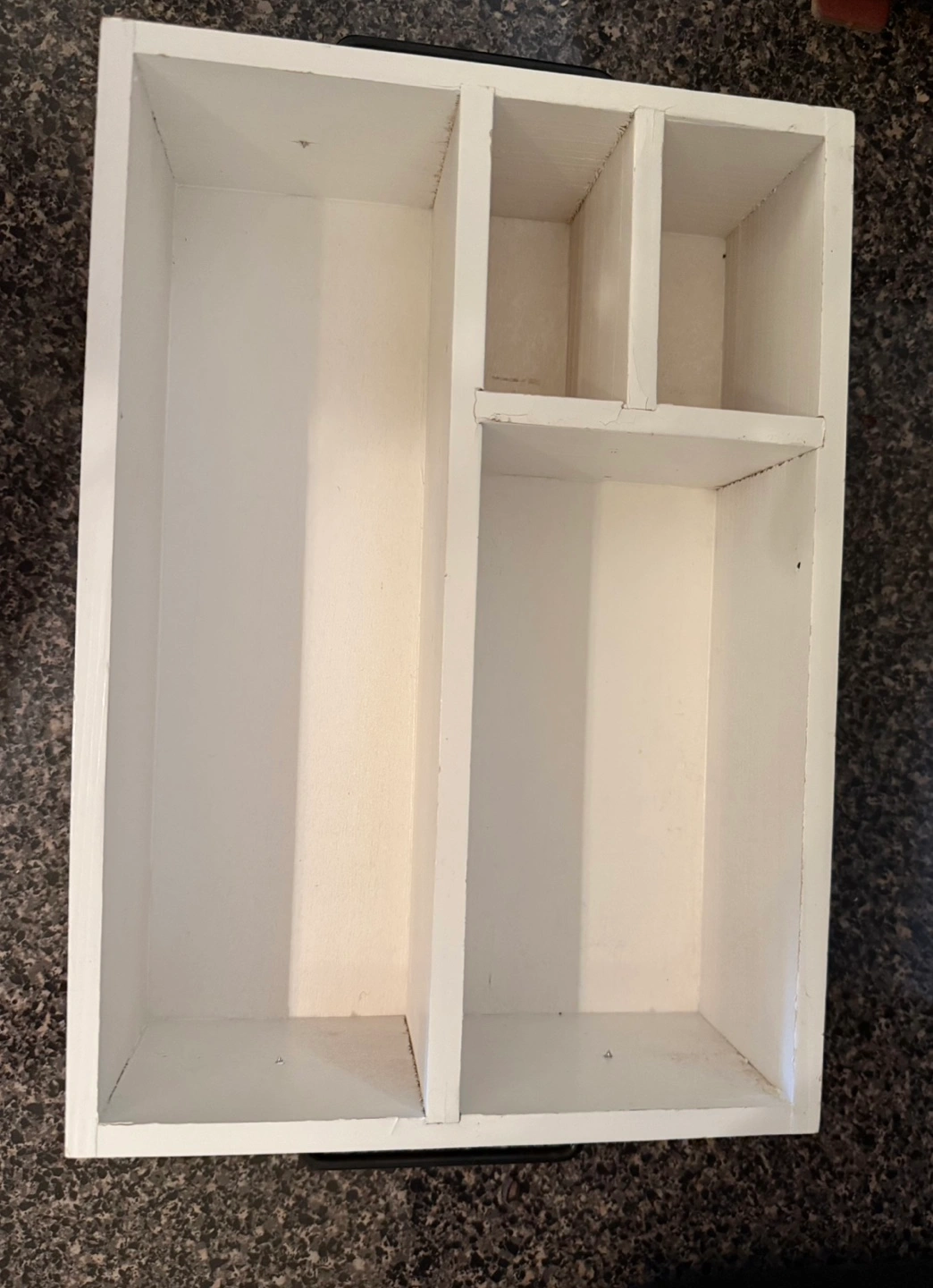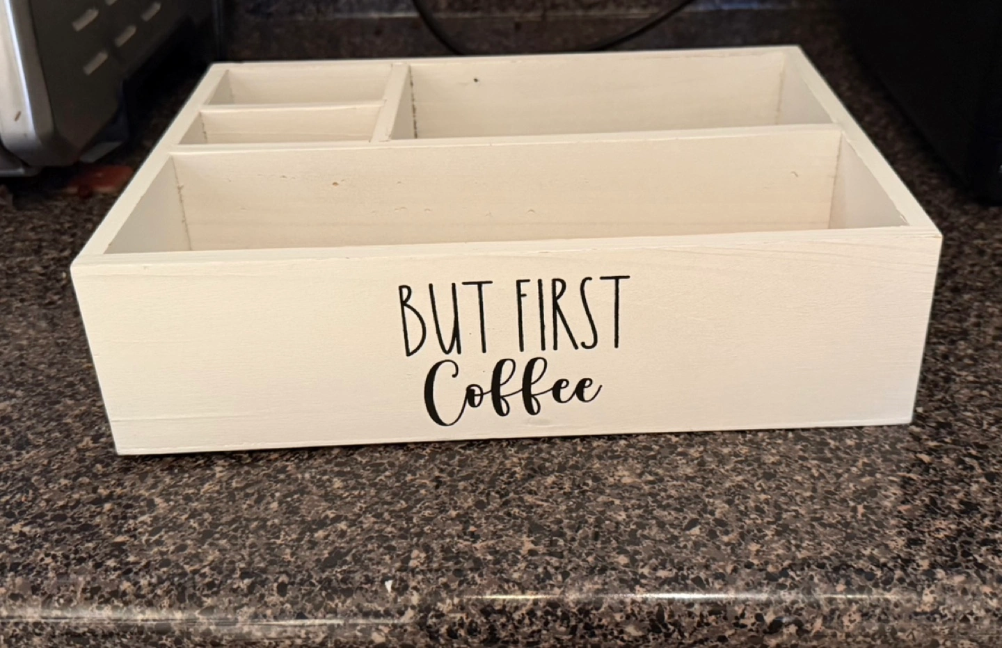 Cute farmhouse style coffee station organizer. Features multiple compartments. Black metal handle. Says "But First Coffee". Perfect for coffee pods, sugar, creamer.