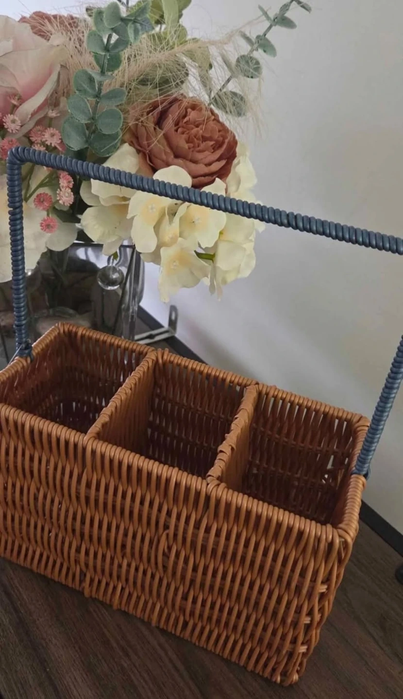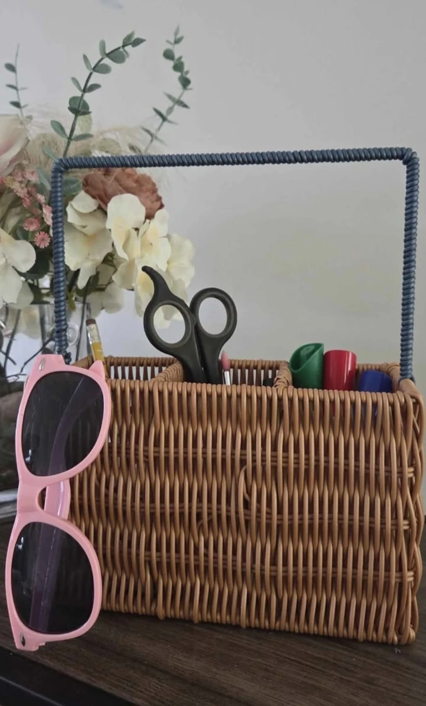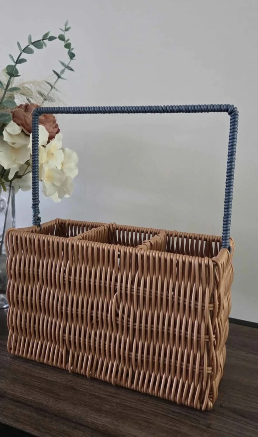 A woven wicker caddy with a blue rope-wrapped handle. It features three compartments inside, perfect for organizing craft supplies or desk items. This caddy is great for keeping small tools and accessories tidy!