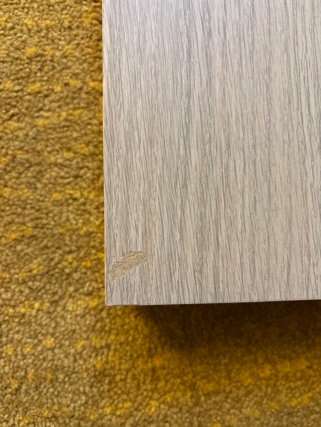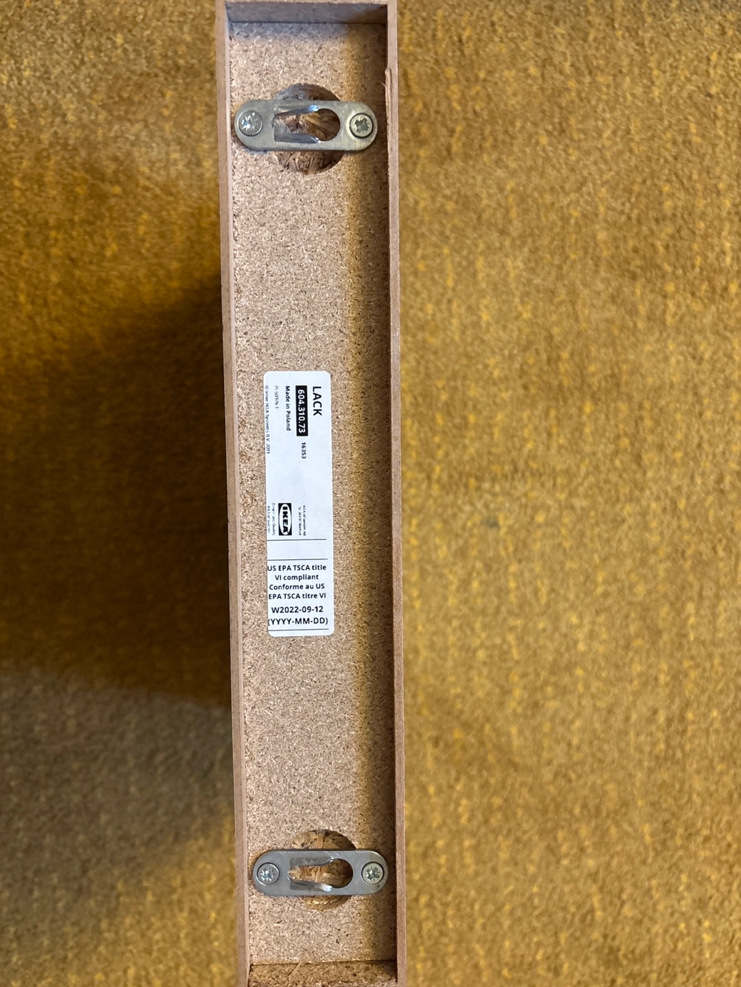 Small section missing finish on the bottom of the shelf. No hanging hardware included when purchased from Ikea.