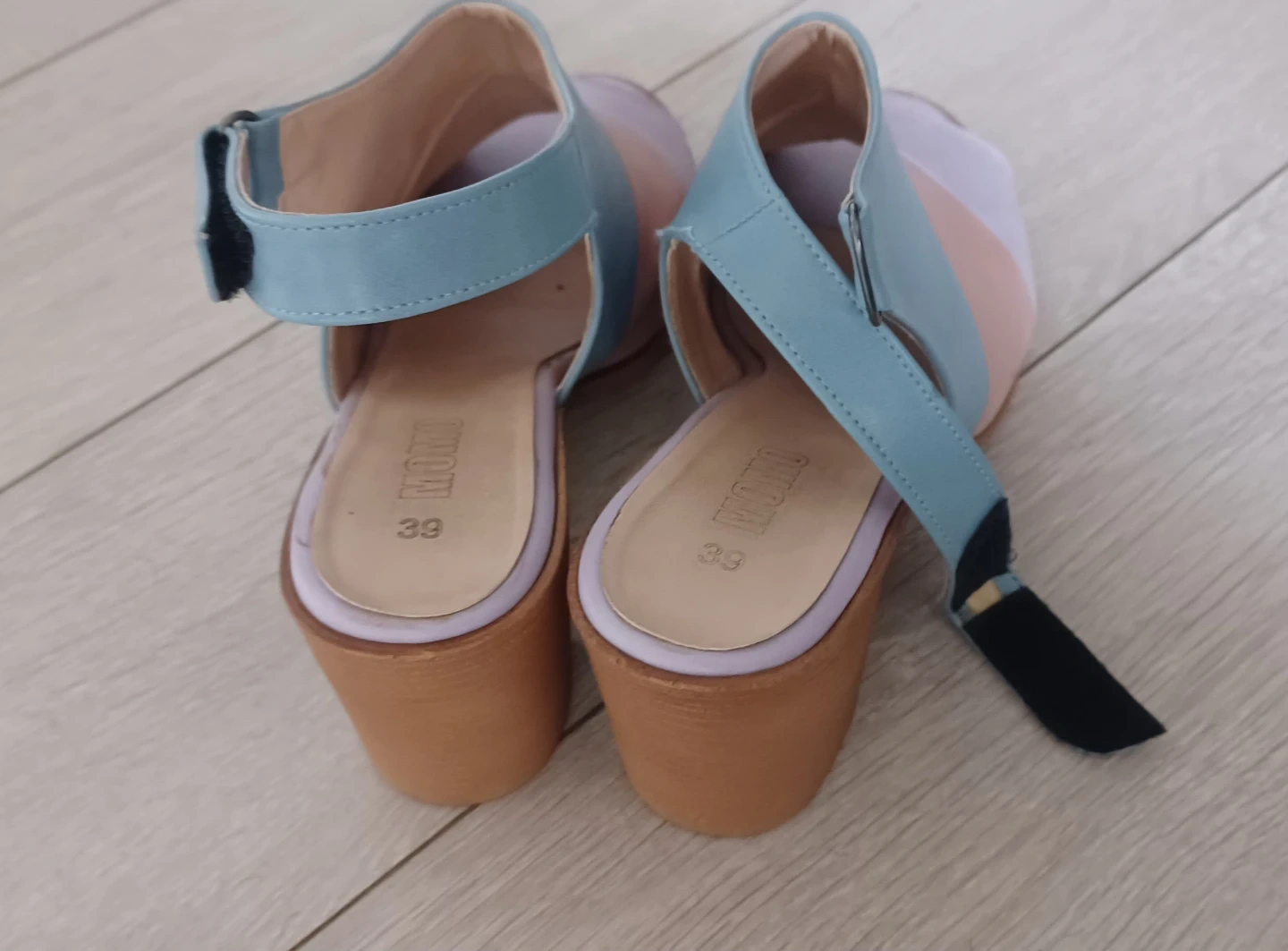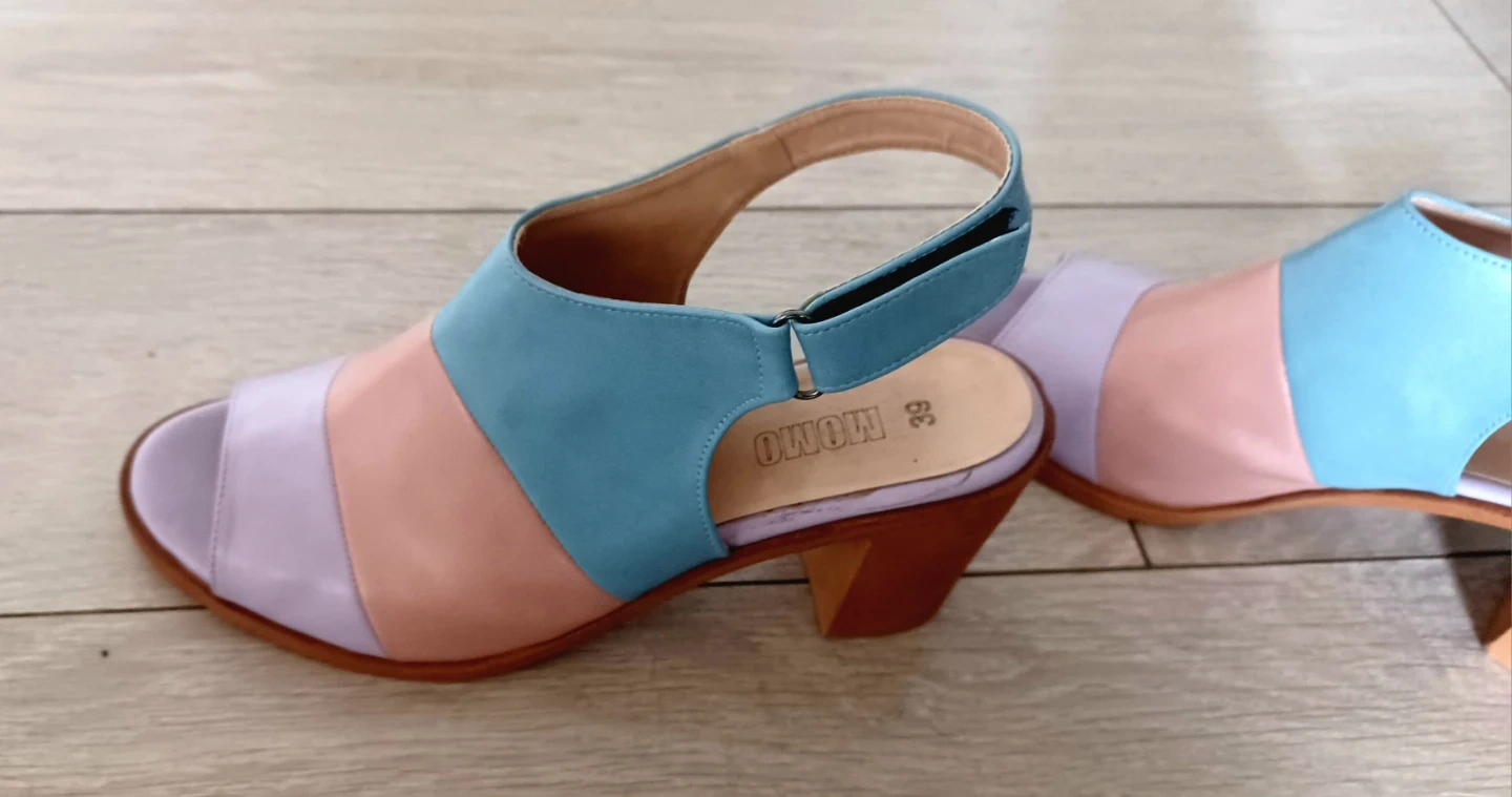 Colour block sandals from MOMO with a chunky block heel. Features an ankle strap with buckle closure. These are size 39 or 8