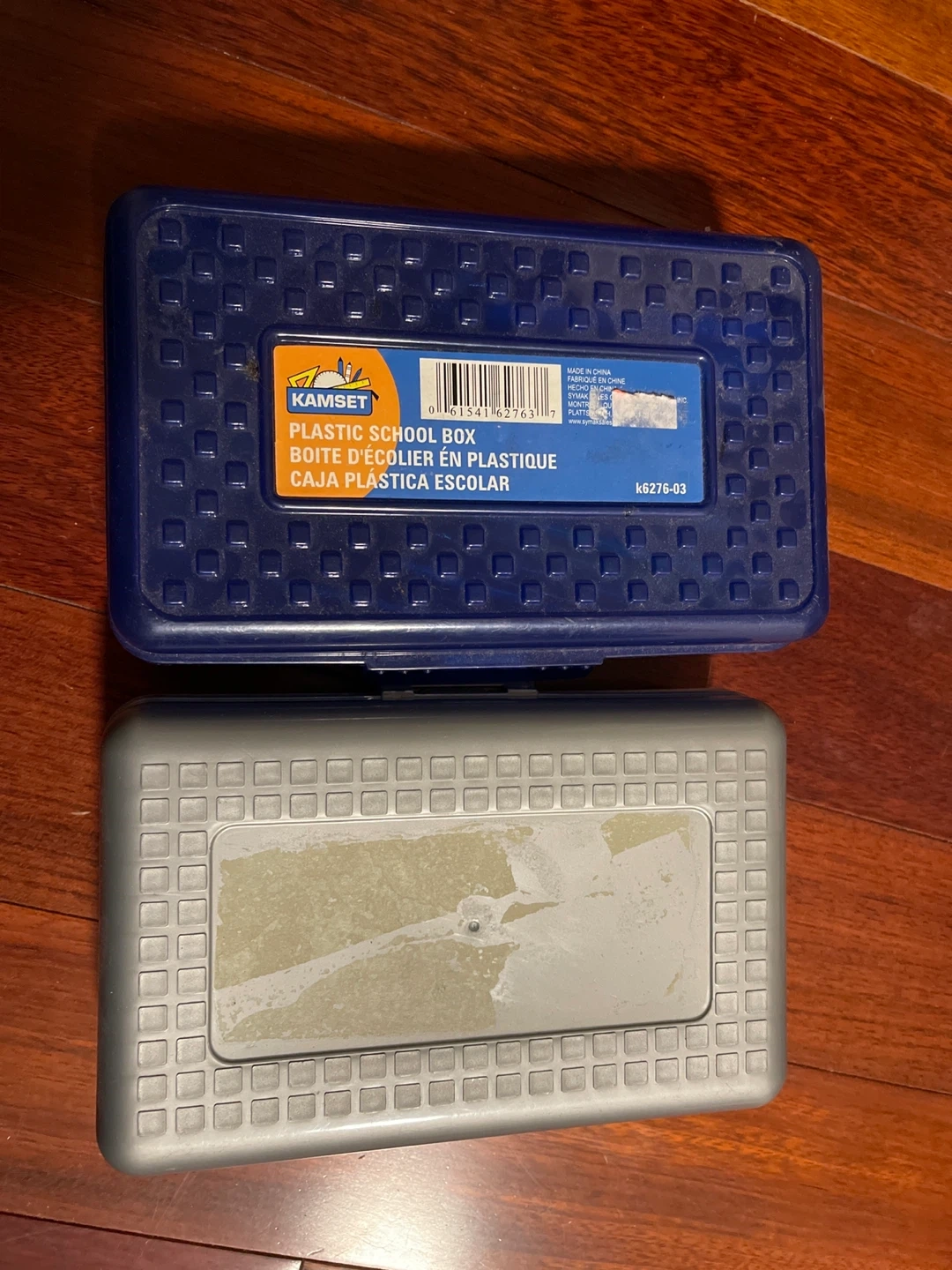 This is a Kamset plastic school box. It's great for keeping your pencils and small supplies organized. The durable plastic design makes it easy to carry.