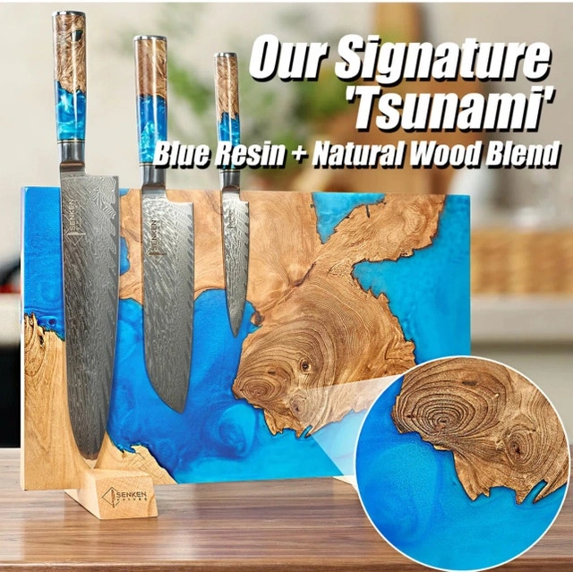 Showcasing a brand new, extra-large 'Tsunami' magnetic knife block, featuring a stunning blue resin and natural wood blend. This block is not just a storage solution but a piece of art for your kitchen, designed to securely hold your knives with powerful, built-in magnets. Its unique design mimics a 'Tsunami', bringing a dynamic and elegant touch to your countertop. Features: Extra-large size for holding a substantial knife collection, Unique 'Tsunami' design with blue resin and natural wood, Powerful, hidden magnets to keep knives securely in place, Adds an aesthetic touch to your kitchen decor. If the ad's still floating, the knife block is available! Cash accepted: Yes. Cashless payment: Yes.