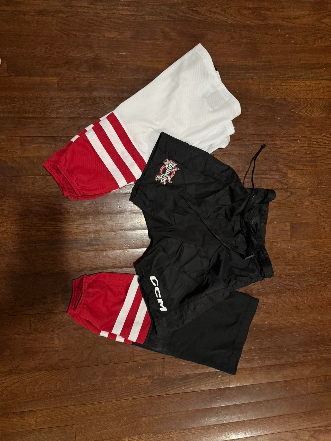 Selling a pair of black CCM hockey pants and a pair of red and white Raiders hockey socks. Perfect for getting back on the ice!